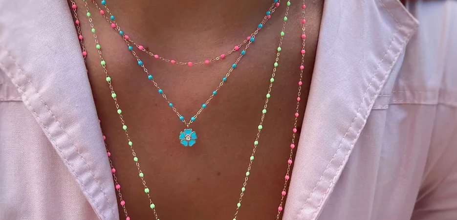 Les créations Gigi Clozeau incarnent un subtil mariage entre tradition artisanale et modernité lumineuse. Chaque bijou est fabriqué en or 18 carats, travaillé avec précision dans l’atelier familial du sud de la France. La marque se distingue par l’utilisation d’une résine colorée unique, appliquée à la main, qui donne vie à des nuances éclatantes et délicates.