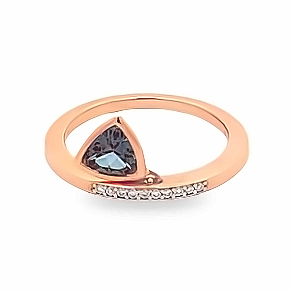 Création artisanale de l’atelier Golaz. Bague en or rouge avec une alexandrite de culture de forme trillant dans un serti clos mobile et rehaussée de diamants de laboratoire
