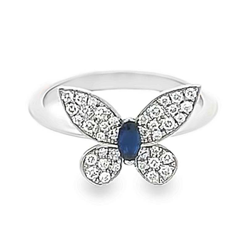 Création artisanale de l’atelier Golaz. Magnifique papillon stylisé, monté en bague et serti de 38 diamants et un saphir taille navette