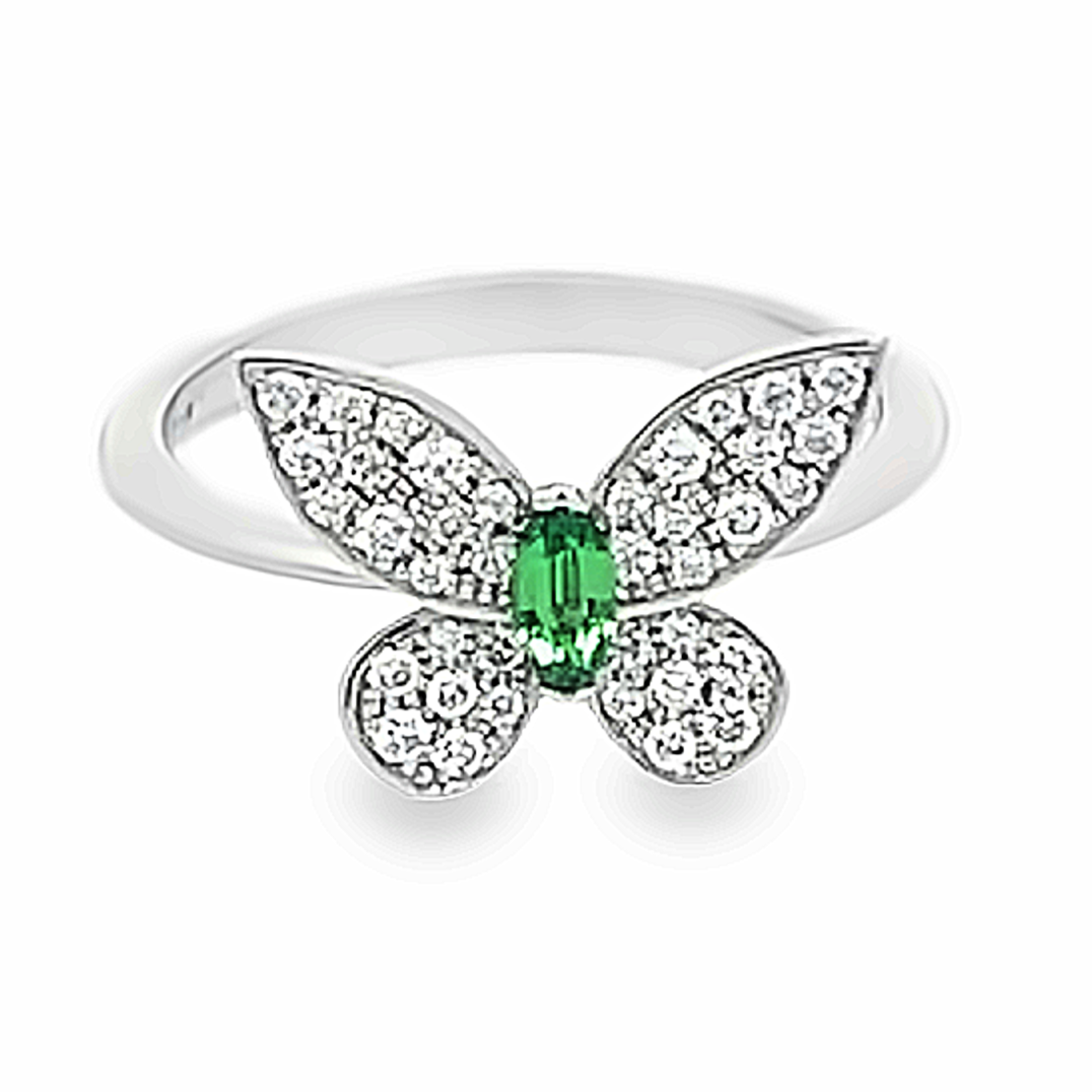 Création artisanale de l’atelier Golaz. Magnifique papillon stylisé, monté en bague et serti de 38 diamants et une tsavorite taille navette