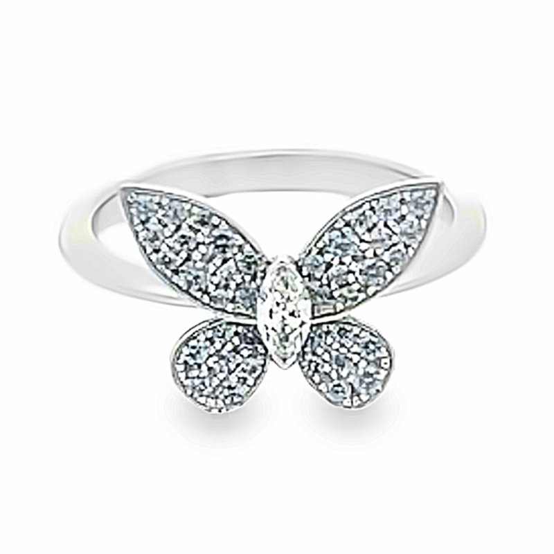 Création artisanale de l’atelier Golaz. Magnifique papilon stylisé monté en bague , serti de 34 grenats qui changent de couleur selon le type de lumière et d’un diamant taille navette