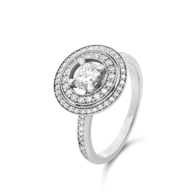 Création artisanale de l’atelier Golaz. Magnifique diamant du Canada entouré de 2 cercles de diamants comme les anneaux de Saturne.