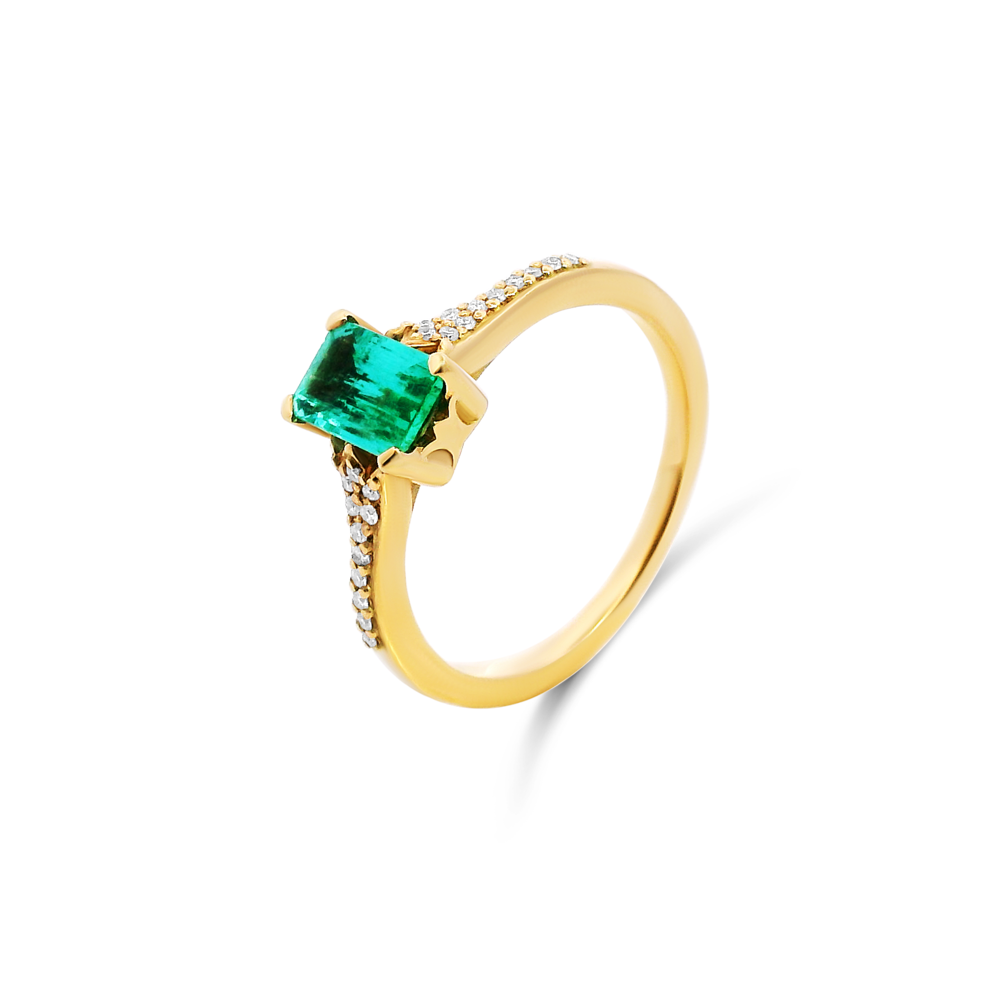 Création artisanale de l’atelier Golaz. Magnifique emeraude montée sur or jaune et accompagnée de diamants sur le corps de bague