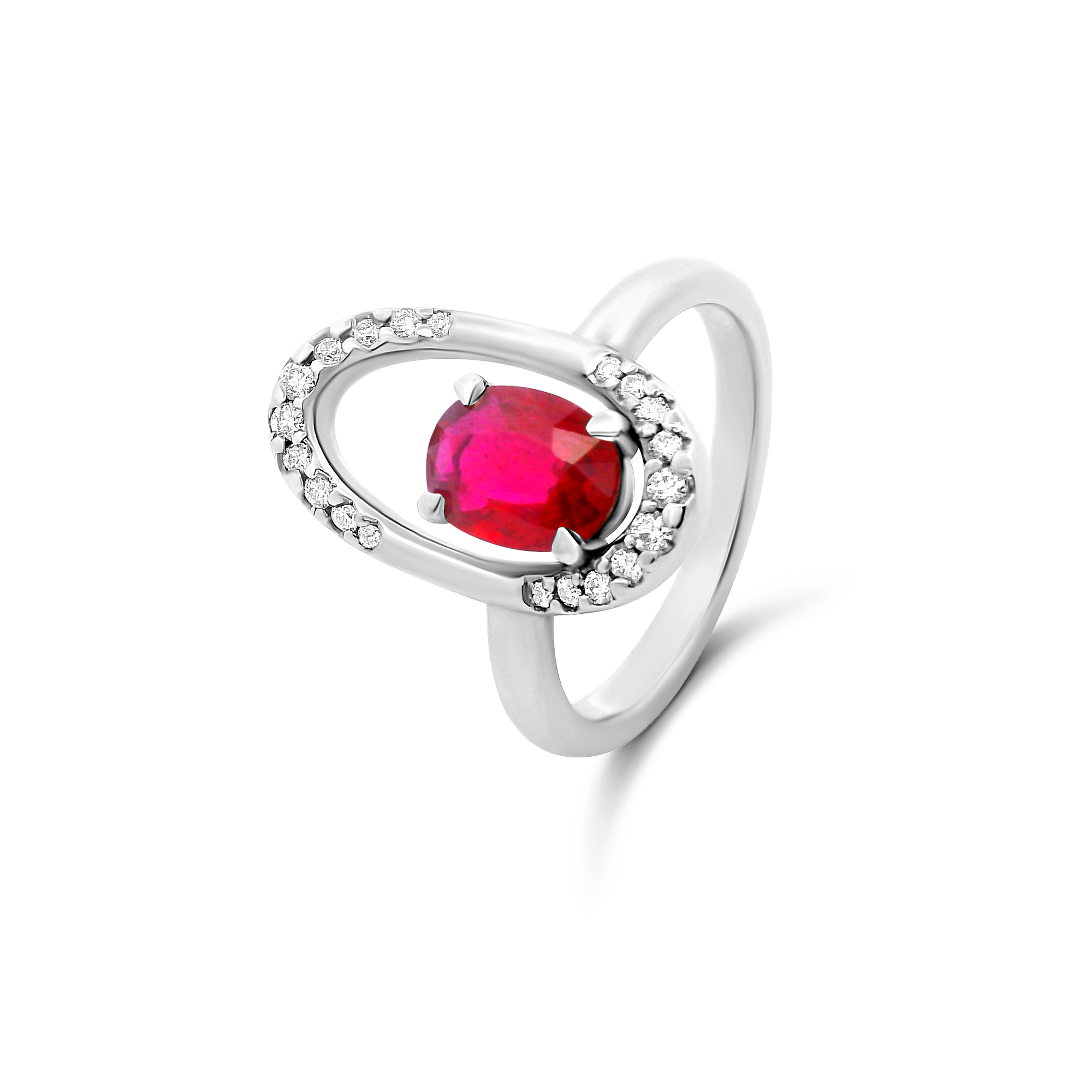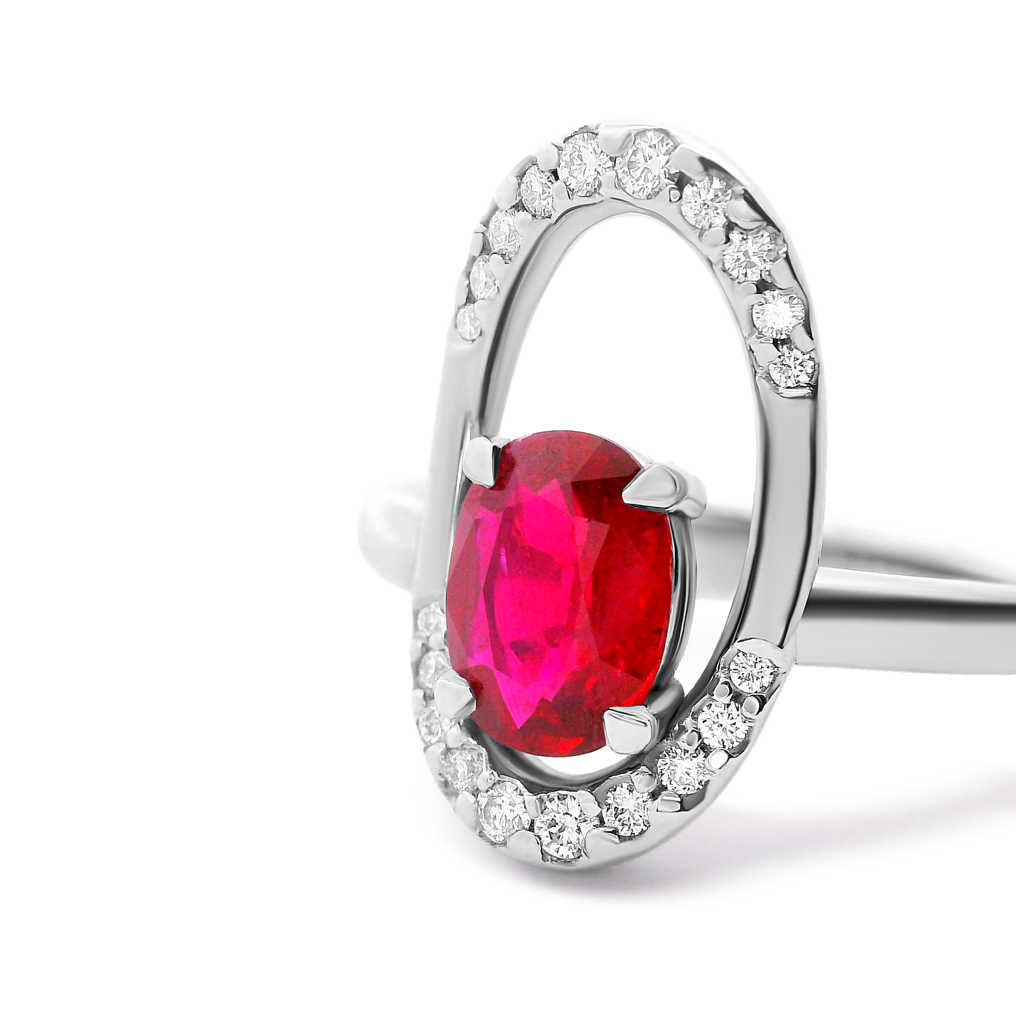 Création artisanale de l’atelier Golaz. Bague or balnc sertie d’un rubis du Groenland de source éthique, sublimé de 20 diamants d’origine cannadienne certifiés disposés sue une élipse décentrée.