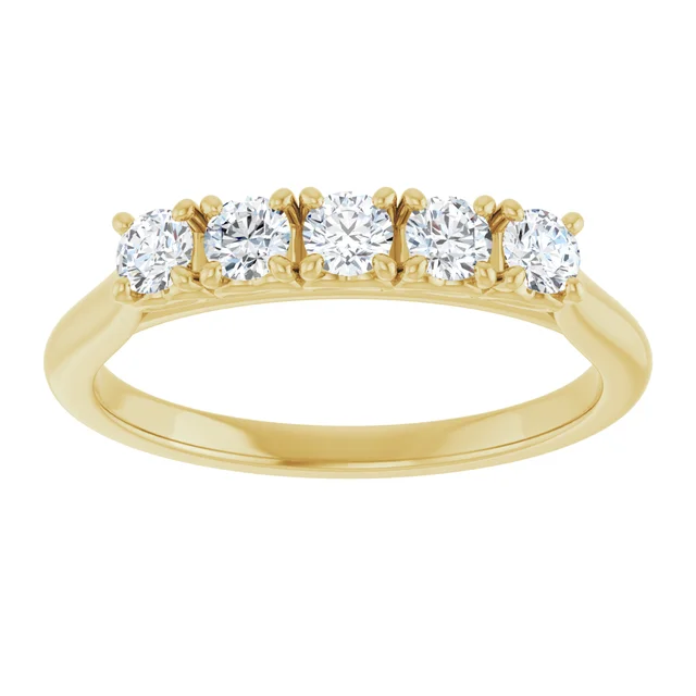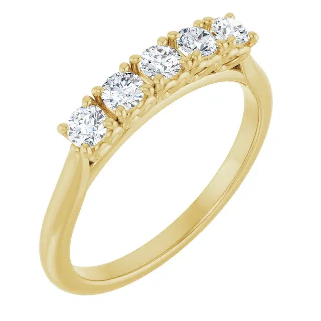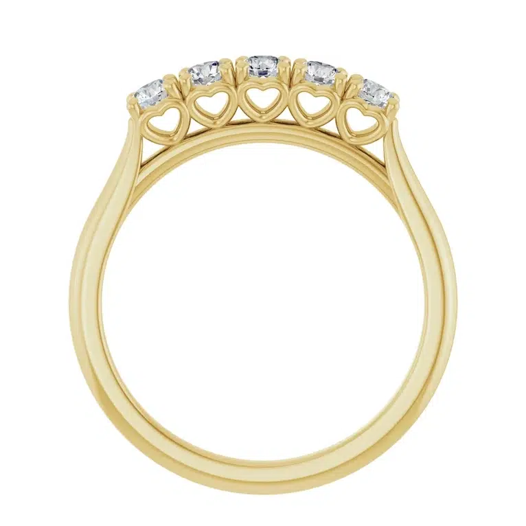 Création artisanale de l’atelier Golaz. Bague en or blanc avec 5 diamants cultivés en laboratoire, serti griffes et arborant discrètement des cœurs sur les côtés.