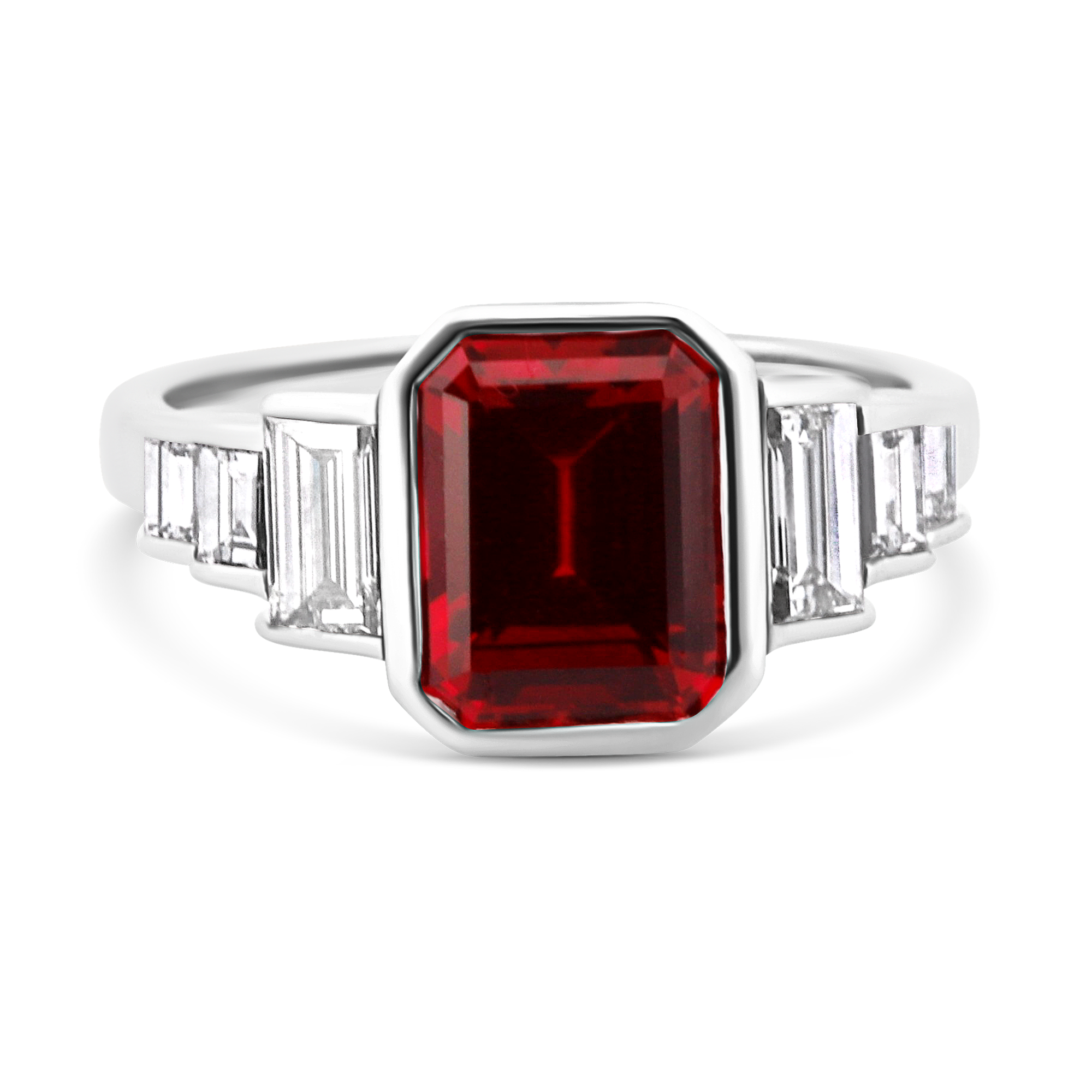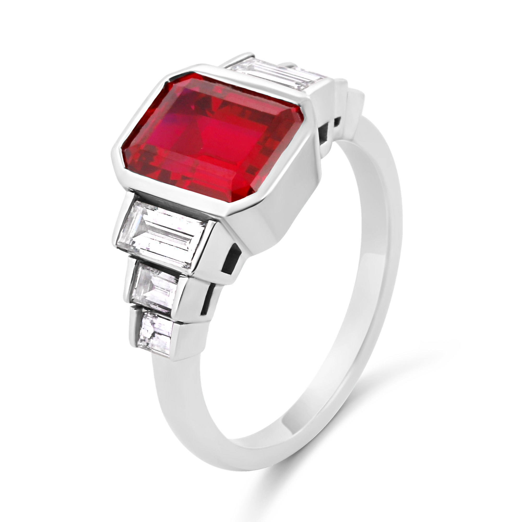 Création artisanale de l’atelier Golaz. Magnifique rubis de culture taille emeraude serti sur une monture style ArtDeco en or blanc et sublimé de diamants de laboratoire taille baguette