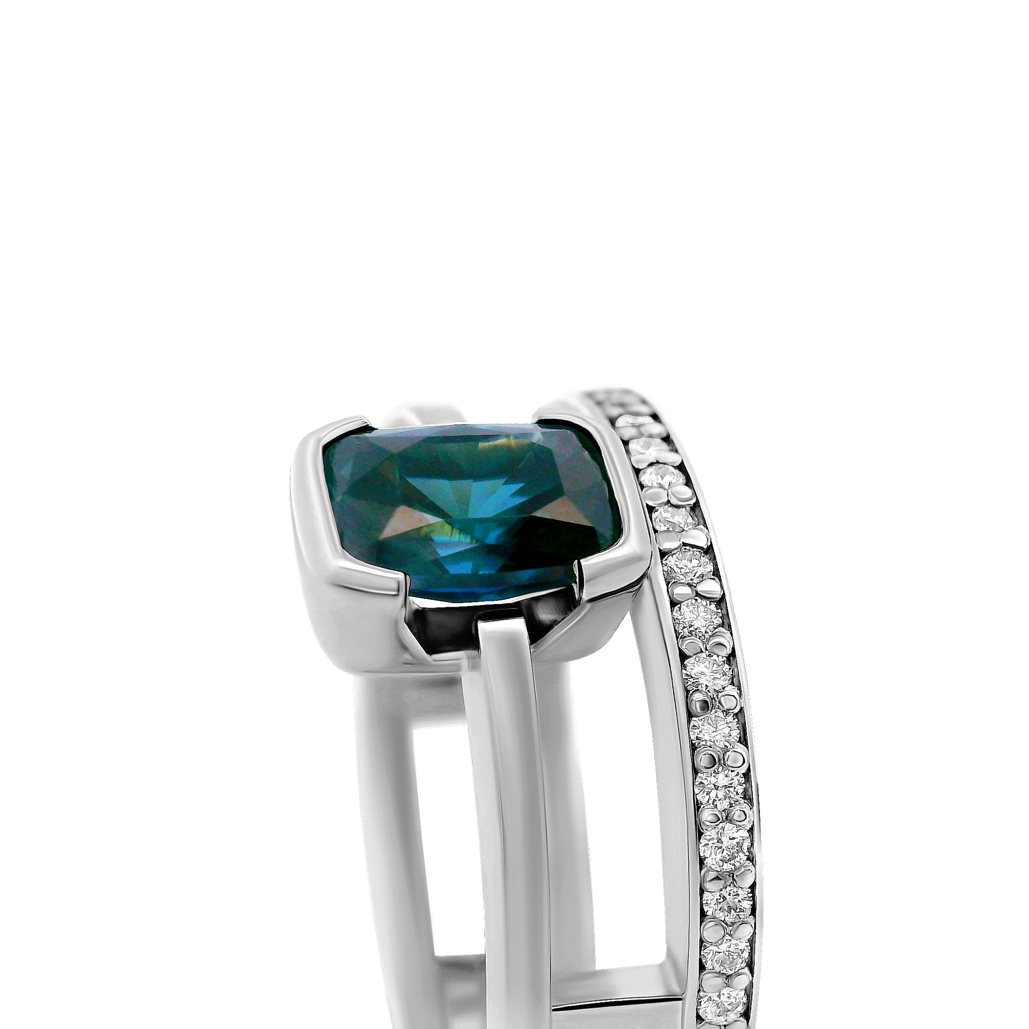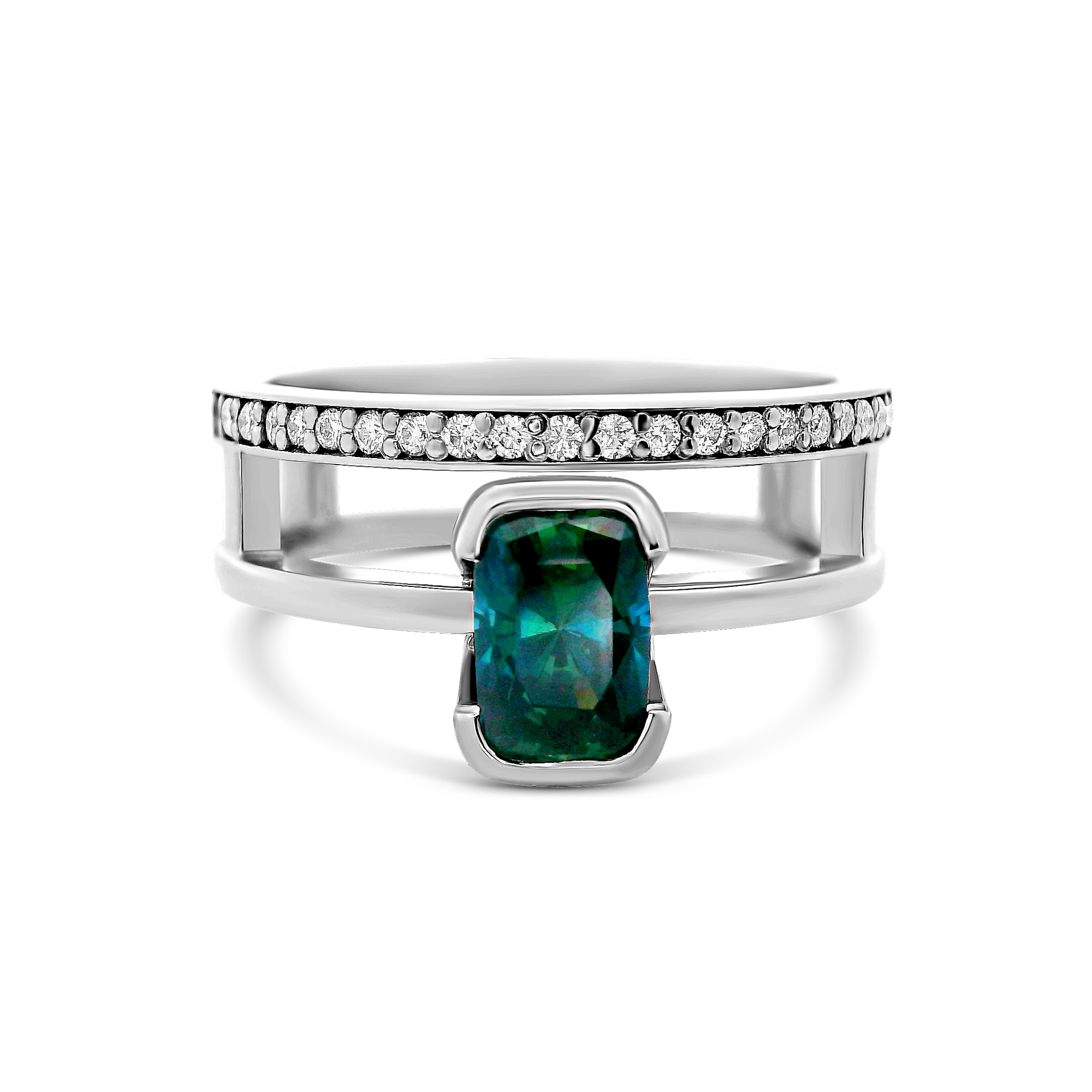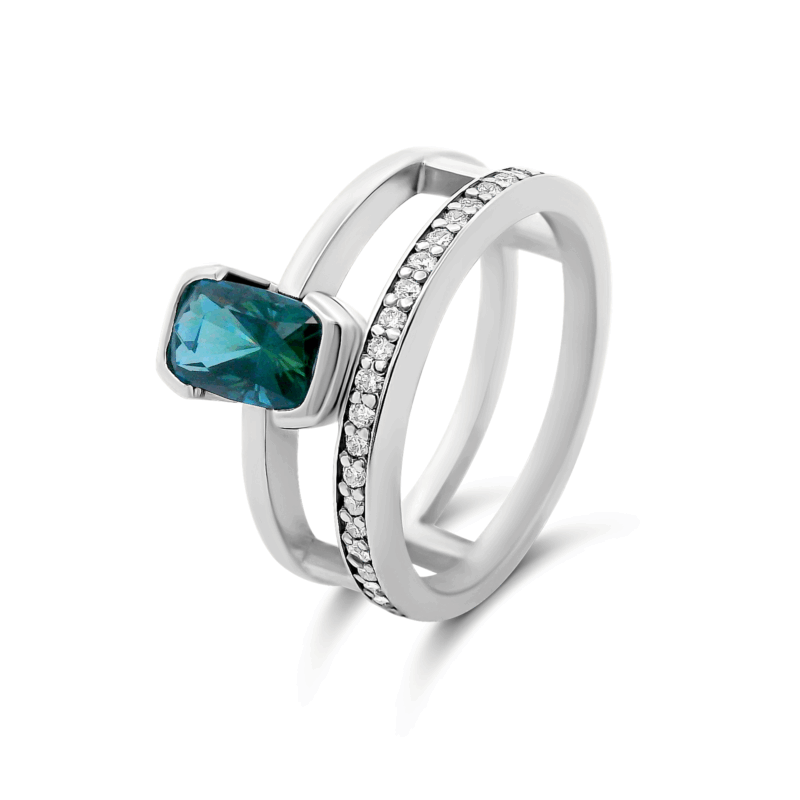 Création artisanale de l’atelier Golaz. Bague or blanc , double rangs avec un Saphir étique des rivères de l’Auvergne taille antique et sublimé de 21 diamants d’origine canadienne