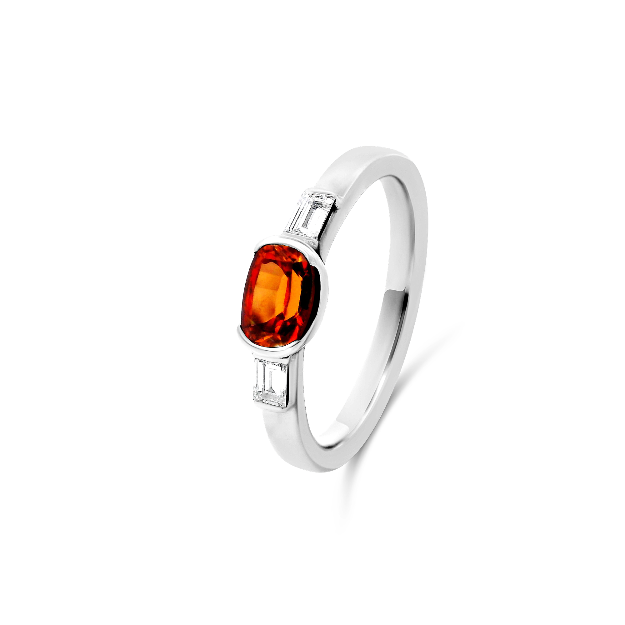 Création artisanale de l’atelier Golaz. Bague en or blanc sertie d’ub saphir padparacha taille antique cultivé en laboratoire et réhaussé de 2 diamant taille baguette de laboratoire sur le corps de bague