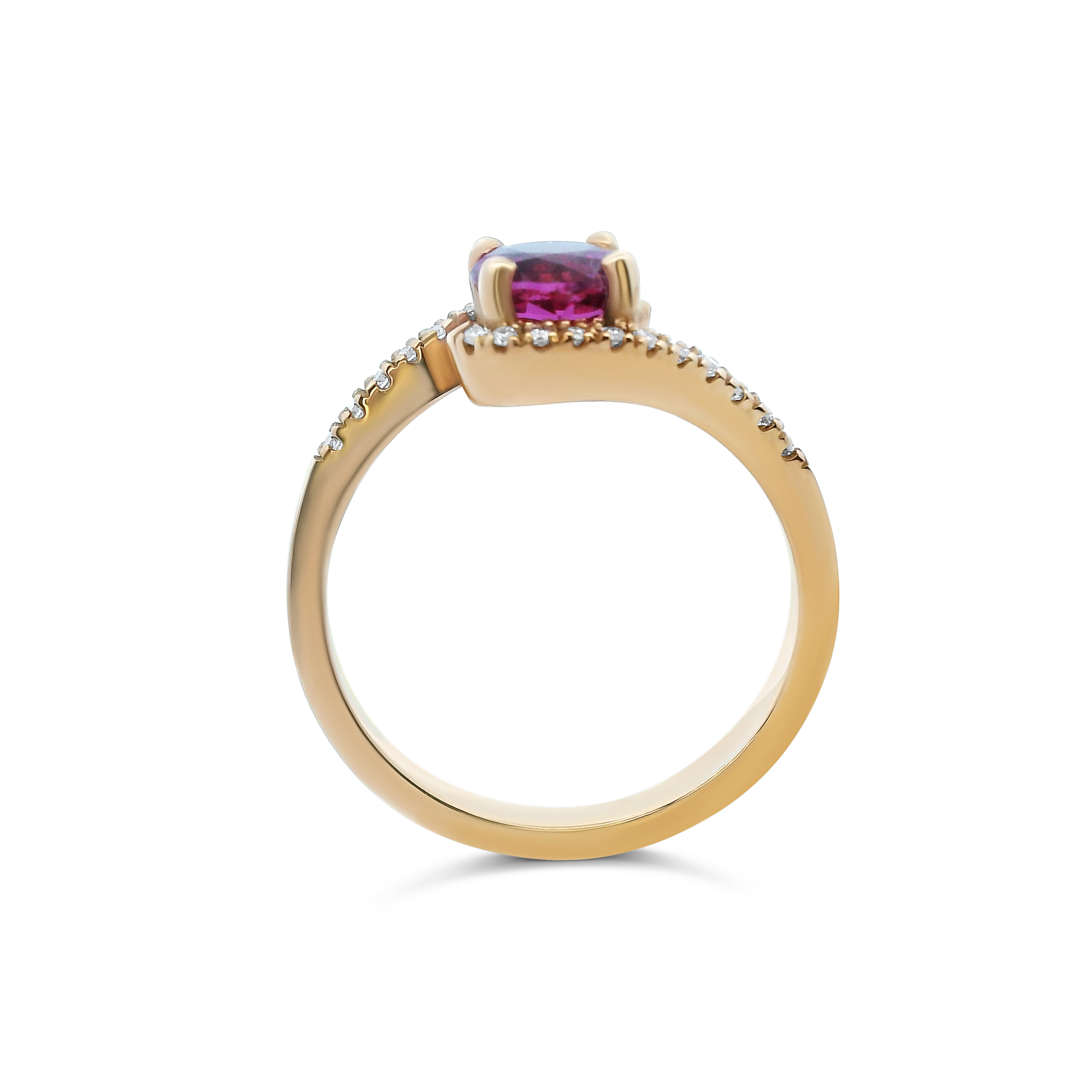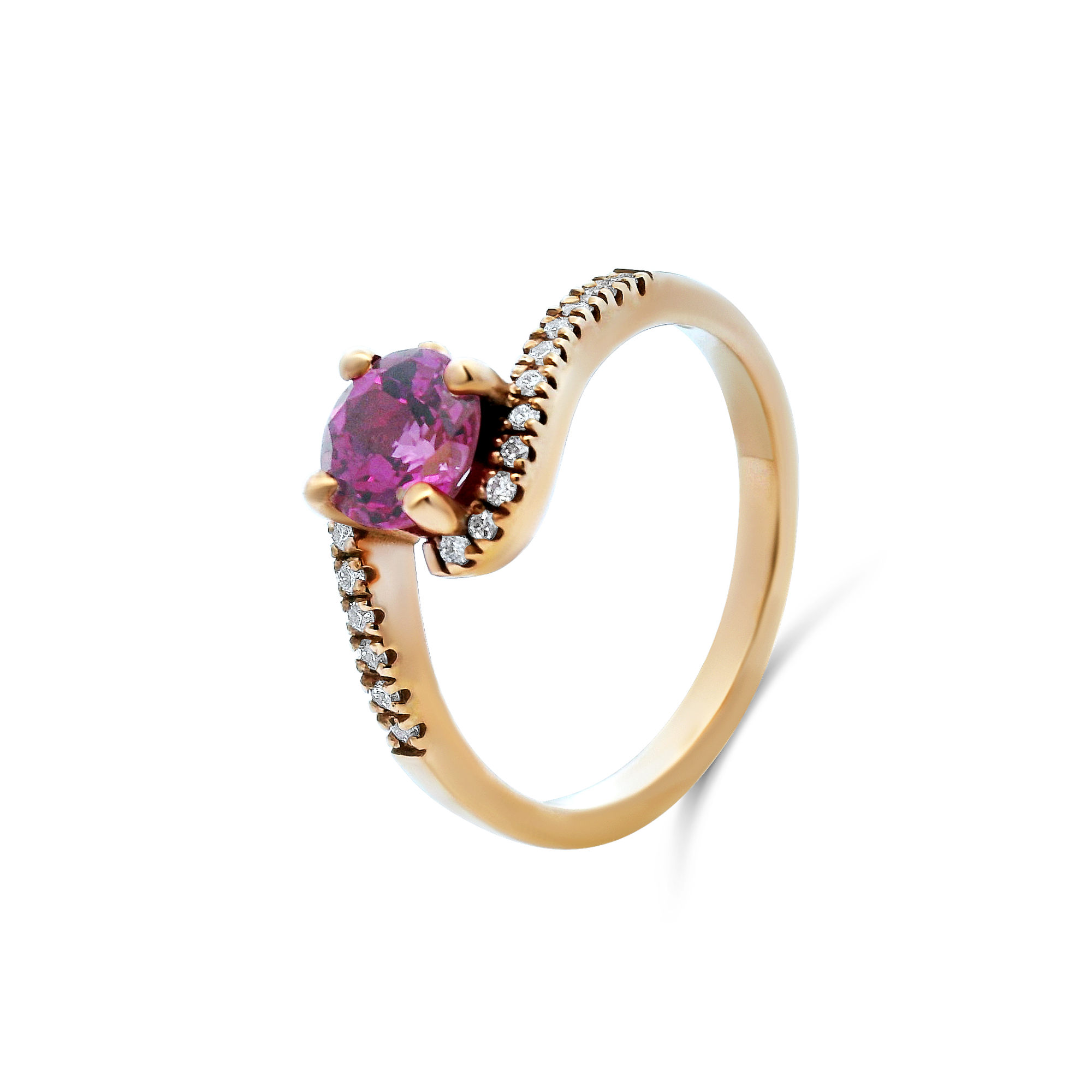 Création artisanale de l’atelier Golaz. Bague croisée serti de diamants de laboratoire et orné d’un magnifique saphir de culture rose