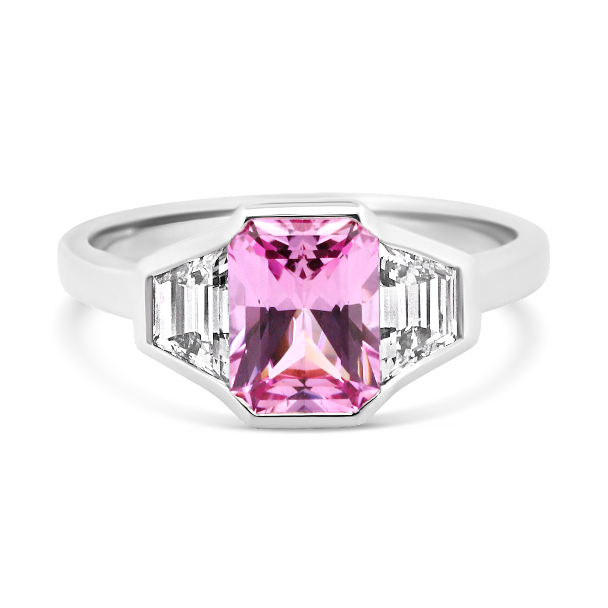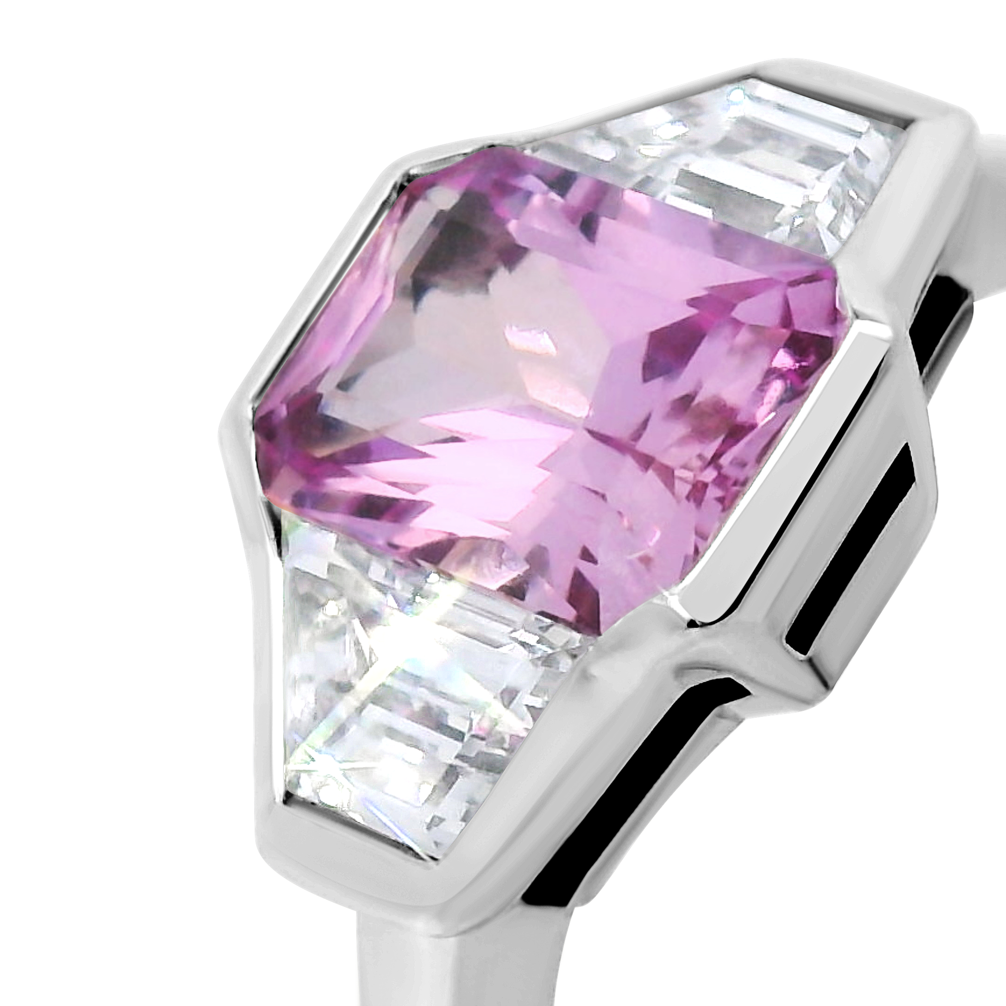 Création artisanale de l’atelier Golaz. Bague en or blanc de type Artdeco ornée d’un saphir rose taille emeraude cultivé en laboratoire et réhaussé de 2 diamants de laboratoire taille trapèze