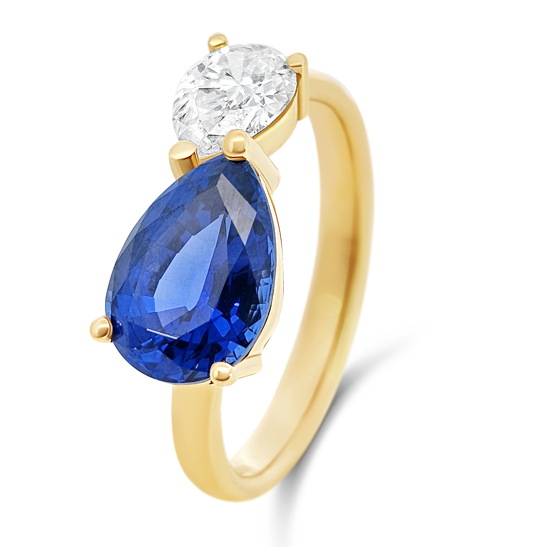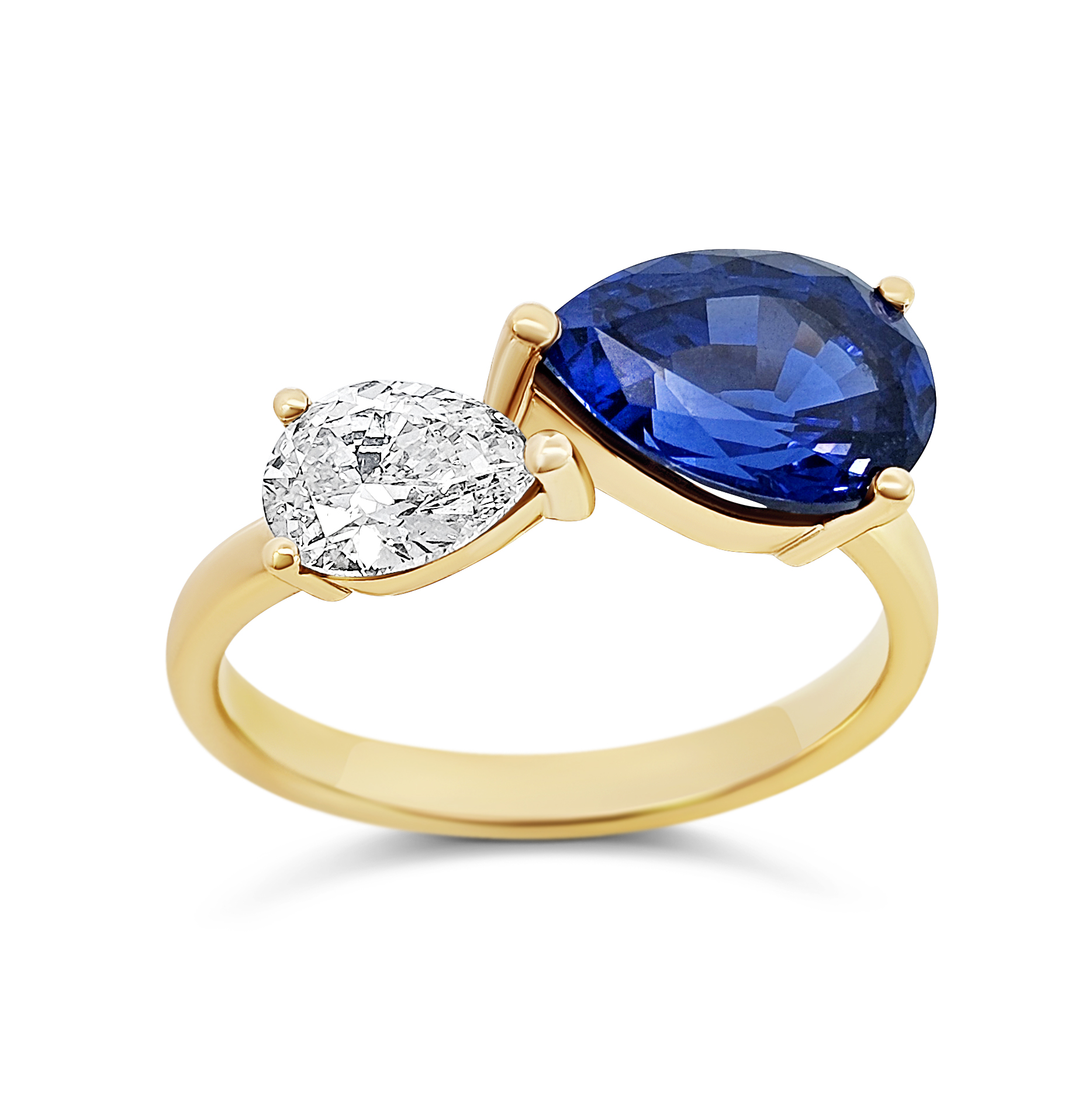 Création artisanale de l’atelier Golaz, la bague Tears of Joy associe un saphir taille poire et un diamant taille poire, disposés en une élégante asymétrie. Deux pierres précieuses qui se répondent, mêlant profondeur et éclat, pour évoquer l’émotion pure et la joie intense.