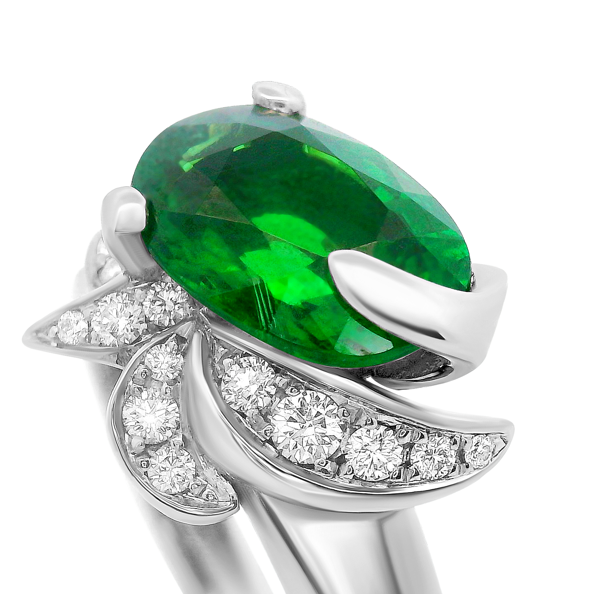 Création artisanale de l’atelier Golaz. Bague en or blanc ornée d’un grenat Tsavorite oval de source éthique et réhausé de 14 diamants d’origine canadienne.