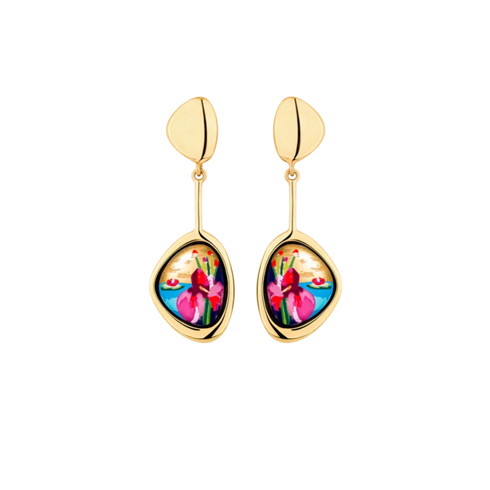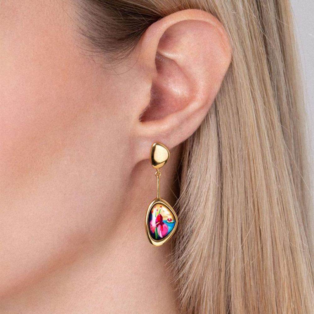Les boucles d »oreilles Pebble Drop montrent la perfection de l »artisanat de la plus belle des manières, elles brillent de couleurs vives et d »or 24kt.