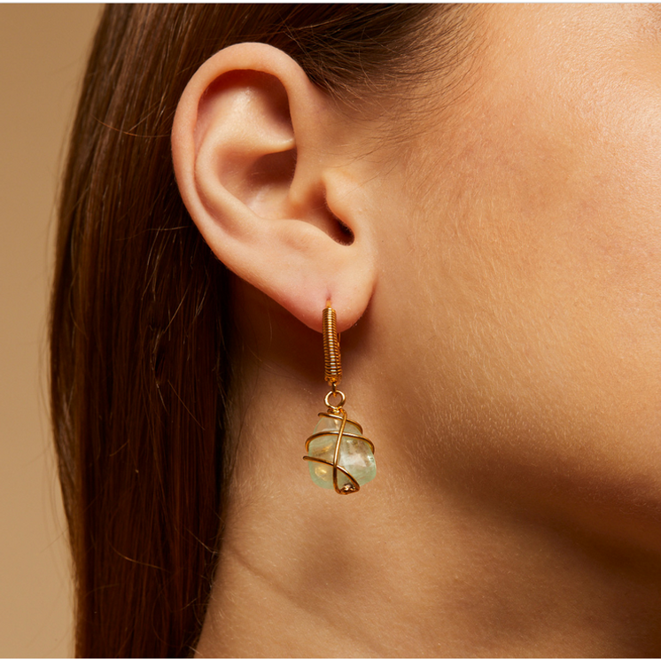 Fines boucles d’oreilles plaquées or, ornées d’une pierre de Fluorine véritable, symbole de stabilité.