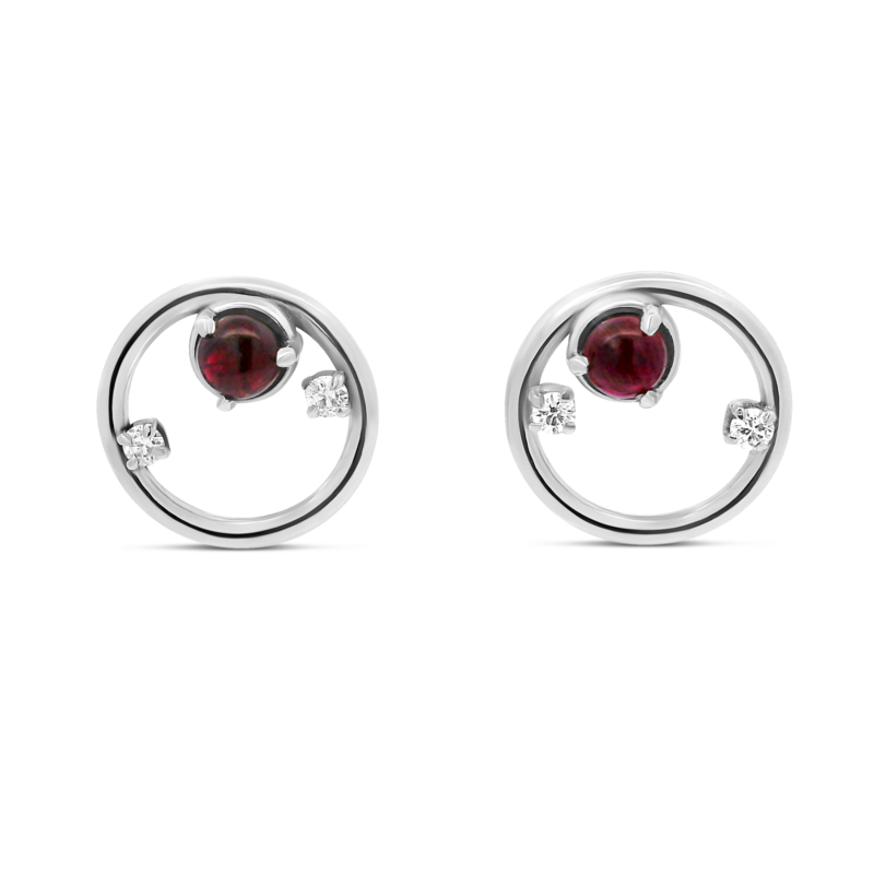 Création artisanale de l’atelier Golaz. Boucles d’oreilles en or blanc ornées de 2 rubis cabochon du Groenland. placé dans un cercle et rehaussés de diamants d’origine Canadienne