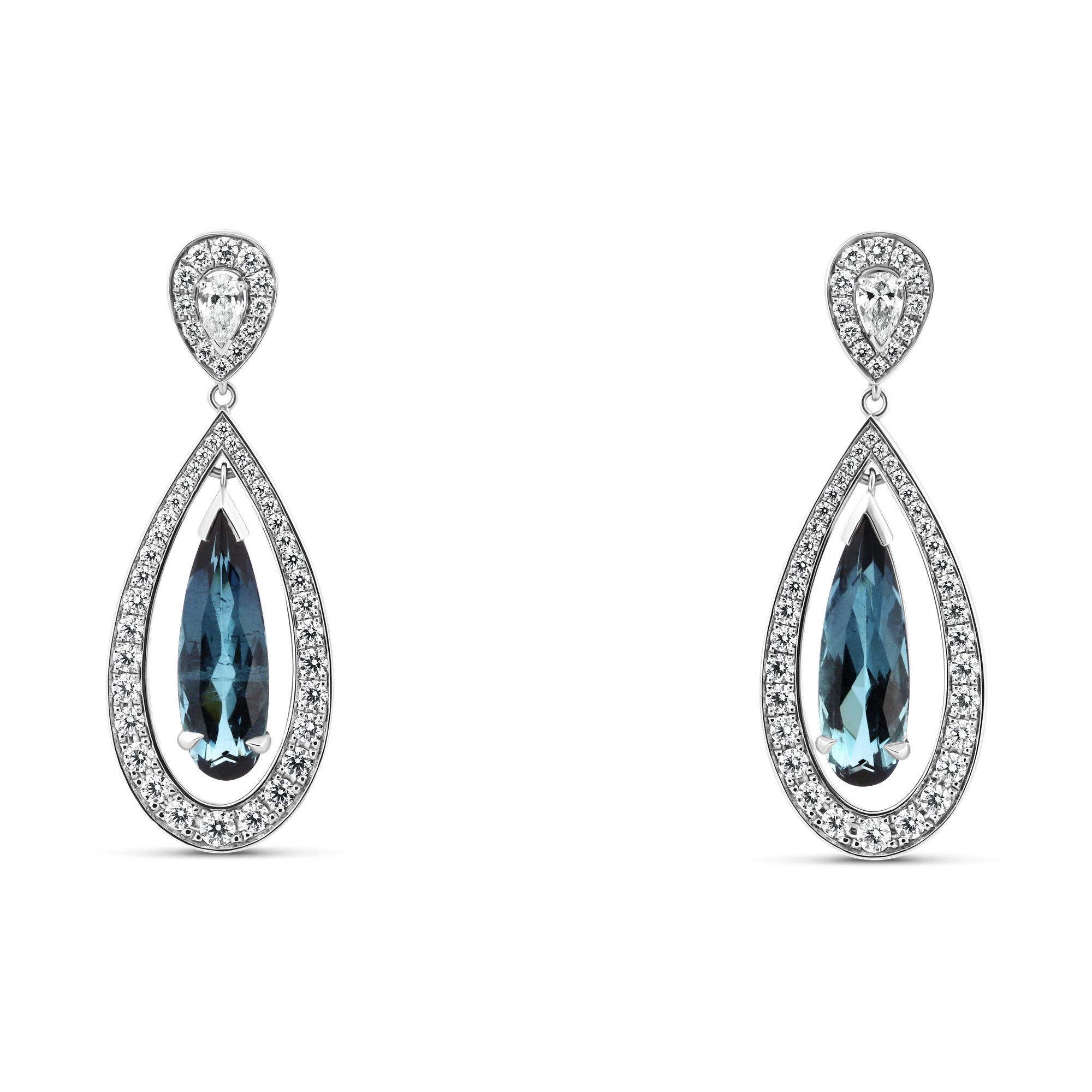 Création artisanale de l’atelier Golaz. Boucles d’oreilles en or blanc, pampilles doubles avec tourmalines indicolites et entourage diamants du canada et 2 diamants taille goutte sur l’oreille