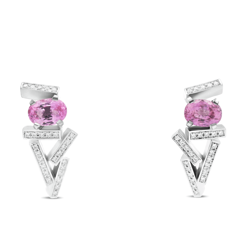 Création artisanale de l’atelier Golaz. Piece unique d’exception, collection Neon, boucles d’oreilles formées de barettes or blanc dont certaines sont serties de diamants et le tout sublimant 2 magnifique saphirs roses naturels.