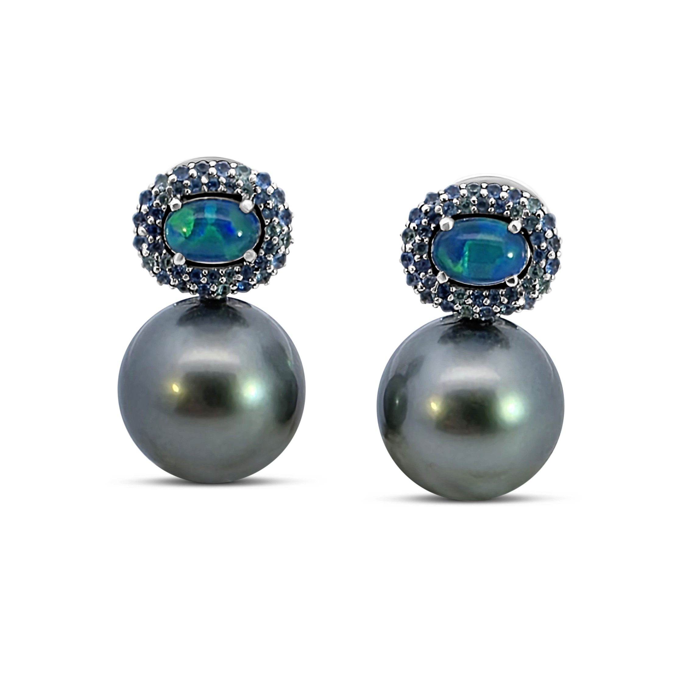 Création artisanale de l’atelier Golaz. Boucles d’oreilles en or blanc serties de 2 opales de culture Blue Green, de 2 perles de Tahiti et d’un pavage de spinelles cultivés en laboratoire. Pièce unique conçue spécialement à l’occasion des 115 ans de la bijouterie.
