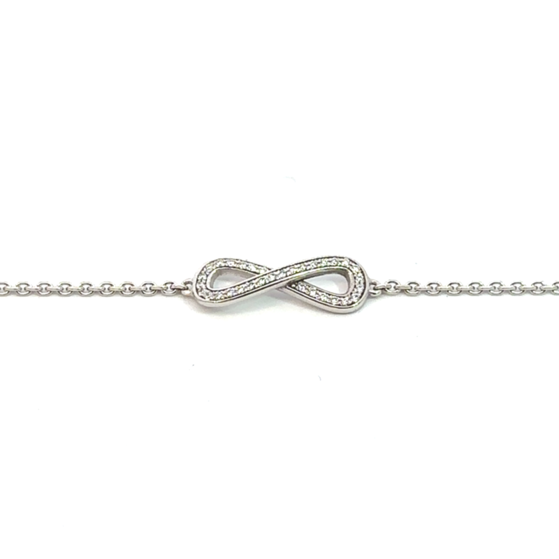 Création artisanale de l’atelier Golaz. bracelet avec motif infini or blanc serti de 32 diamants cultivés en laboratoire