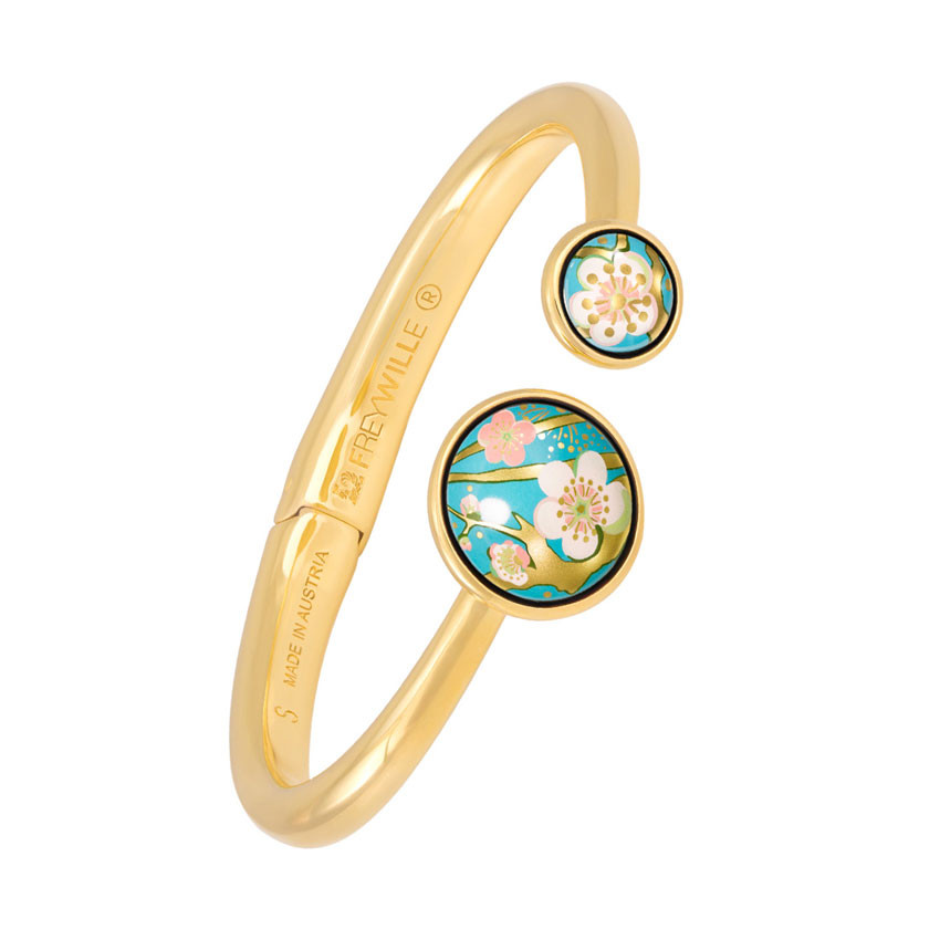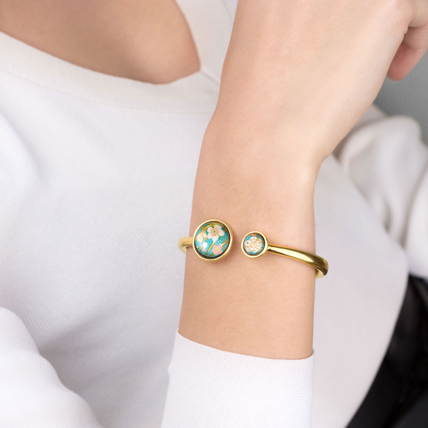 Le bracelet Spring de FREYWILLE fusionne artisanat et modernité. Cette pièce magnifique, dotée de deux cabochons en émail de tailles graduées, s »ouvre et se ferme aisément tout en se reposant confortablement autour de votre poignet. Un bijou attrayant, étincelant, qui attire l »attention tant le jour que la nuit.