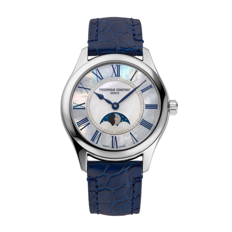 La Classics Elegance Luna est une nouvelle création au sein de la collection Classics de Frederique Constant. Une grande première pour la Maison, sa phase de lune a été dessinée par la fille du directeur de la Recherche & Développement de la Manufacture. Une lune complice et amoureuse, représentant deux demi-lunes qui s’embrassent, déployée sur un cadran en nacre au sein d’une boîte en acier de 36 mm.