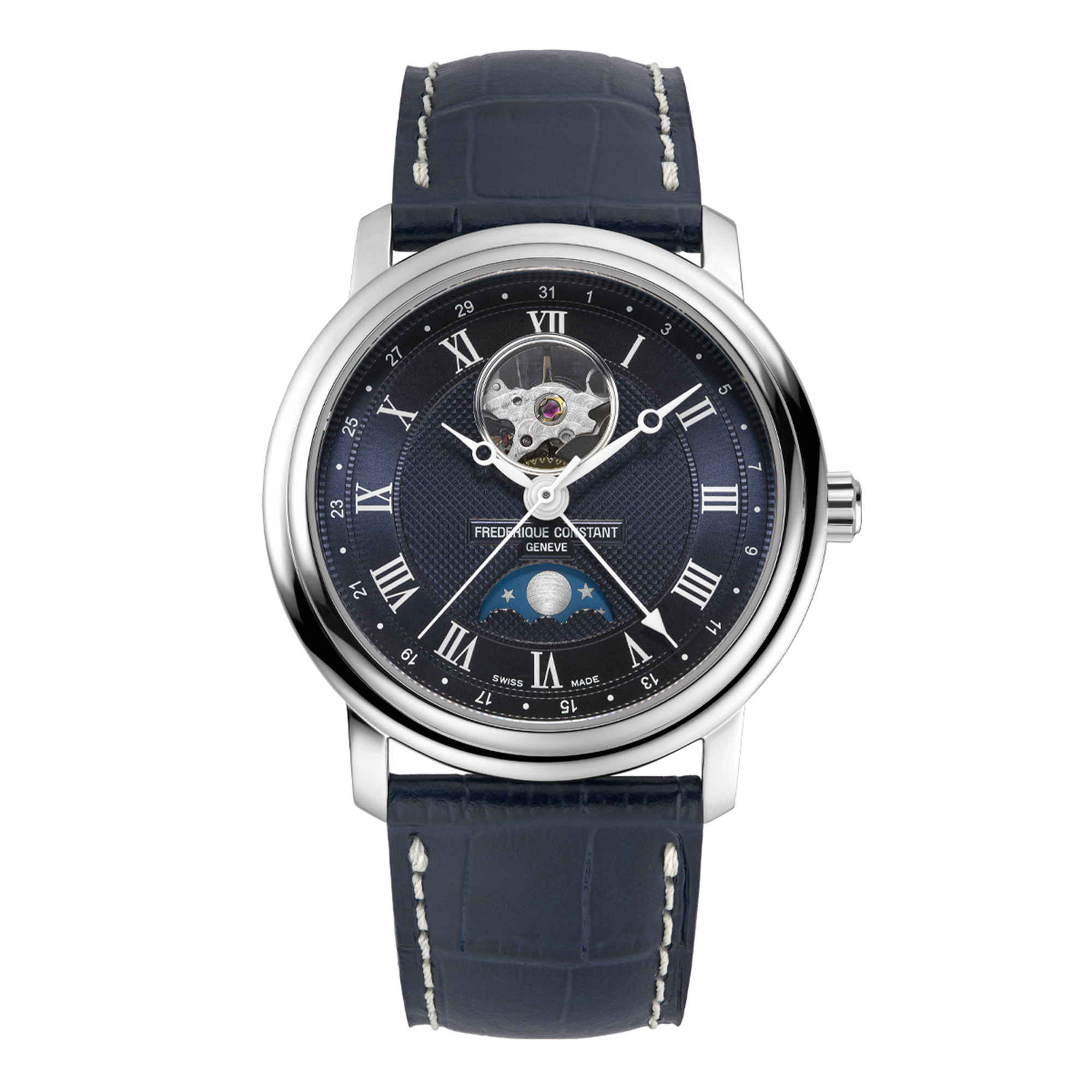 Équipé du mouvement automatique FC-335 Heart Beat, le modèle Classics Heart Beat Moonphase Date affiche un cadran au décor élaboré : un ornement guilloché clous de Paris classique mis en valeur par des index à chiffres romains traditionnels. L’ouverture emblématique à midi, typique des montres Heart Beat, révèle l’échappement en mouvement constant. Cette montre affiche les heures, les minutes, les secondes, la phase lunaire et un indicateur de date.
