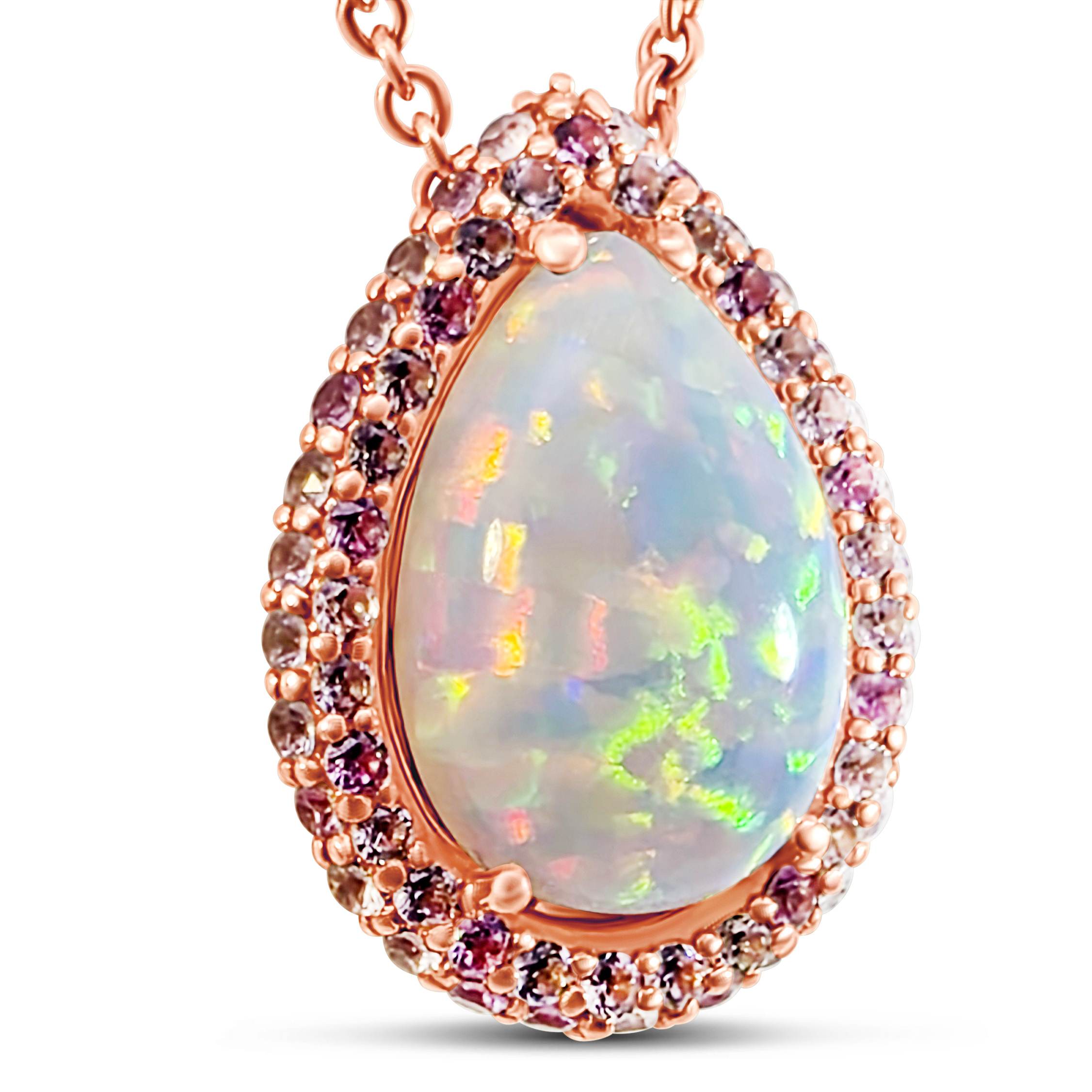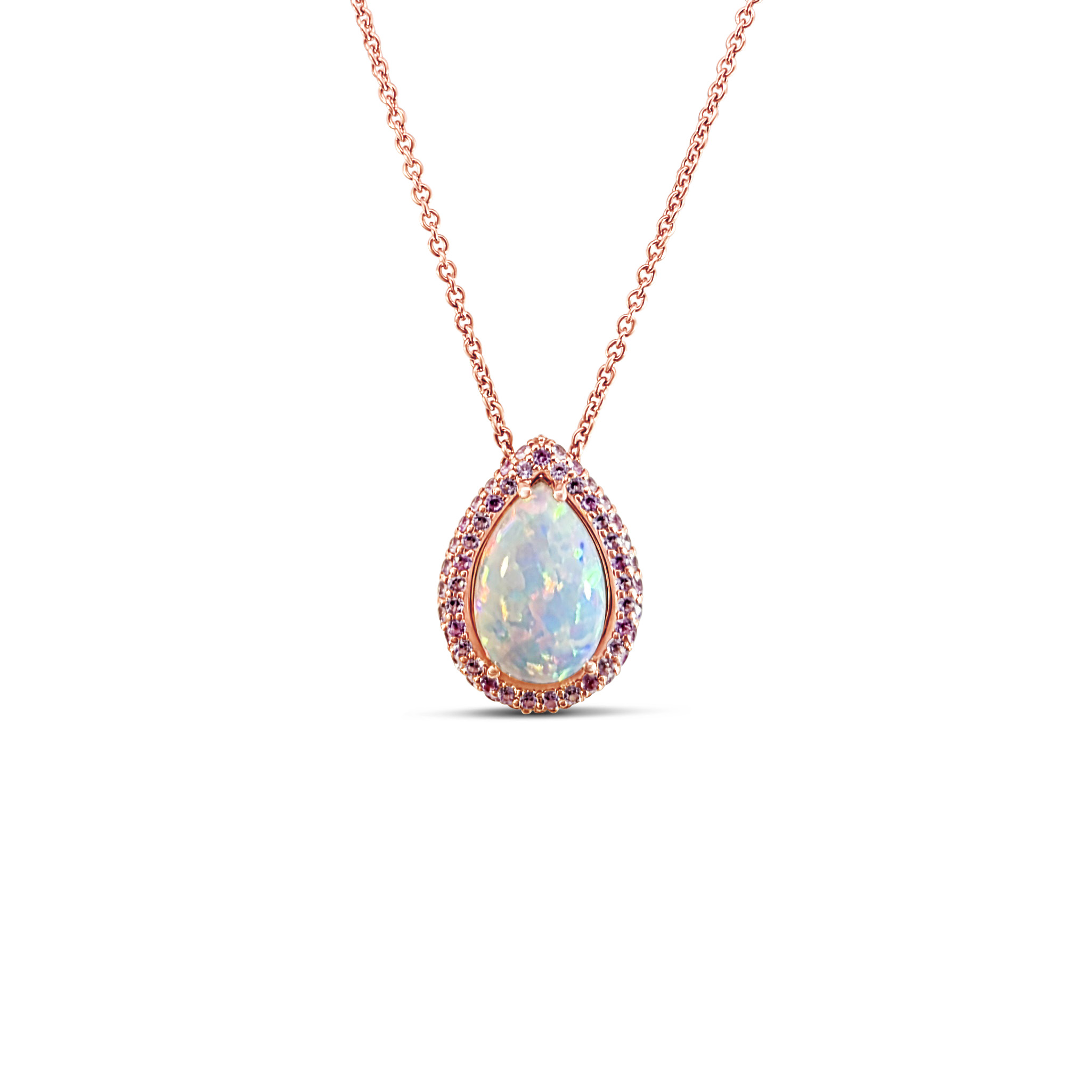 Création artisanale de l’atelier Golaz. Collier en or rose serti d’une opale de culture Pink Red et de 57 saphirs roses cultivés en laboratoire. Pièce unique conçue spécialement à l’occasion des 115 ans de la bijouterie.