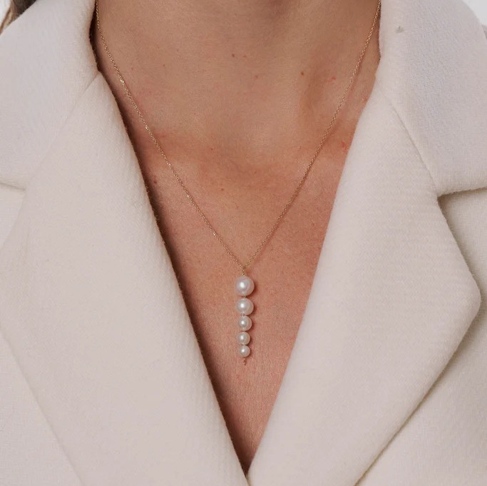 Chaque perle, soigneusement sélectionnée pour sa luminosité et son charme, cascade avec grâce le long de la fine chaîne, dessinant un ballet captivant de lumière et de mouvement. Au gré de leurs oscillations, elles diffusent une lueur douce et envoûtante qui illumine délicatement le décolleté.