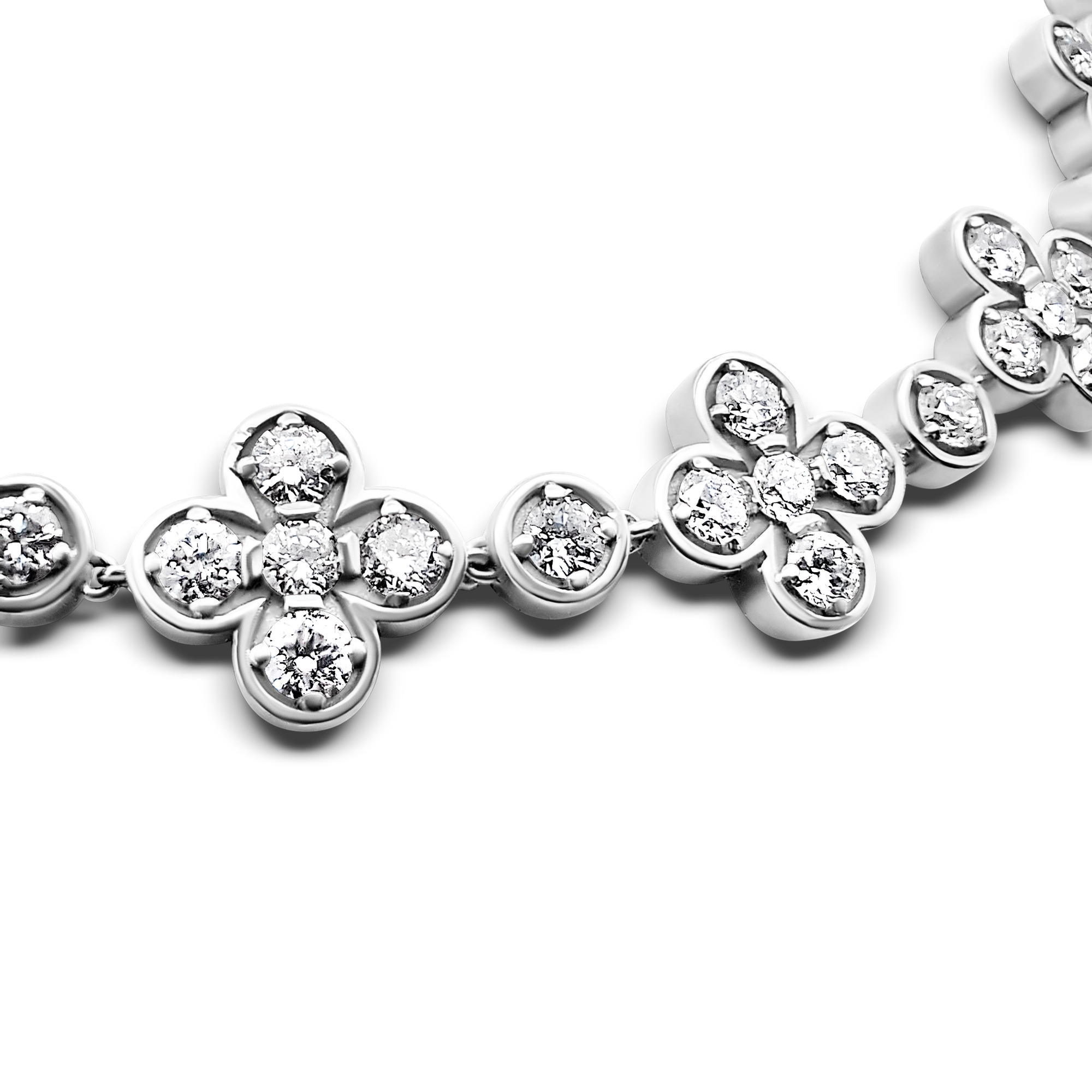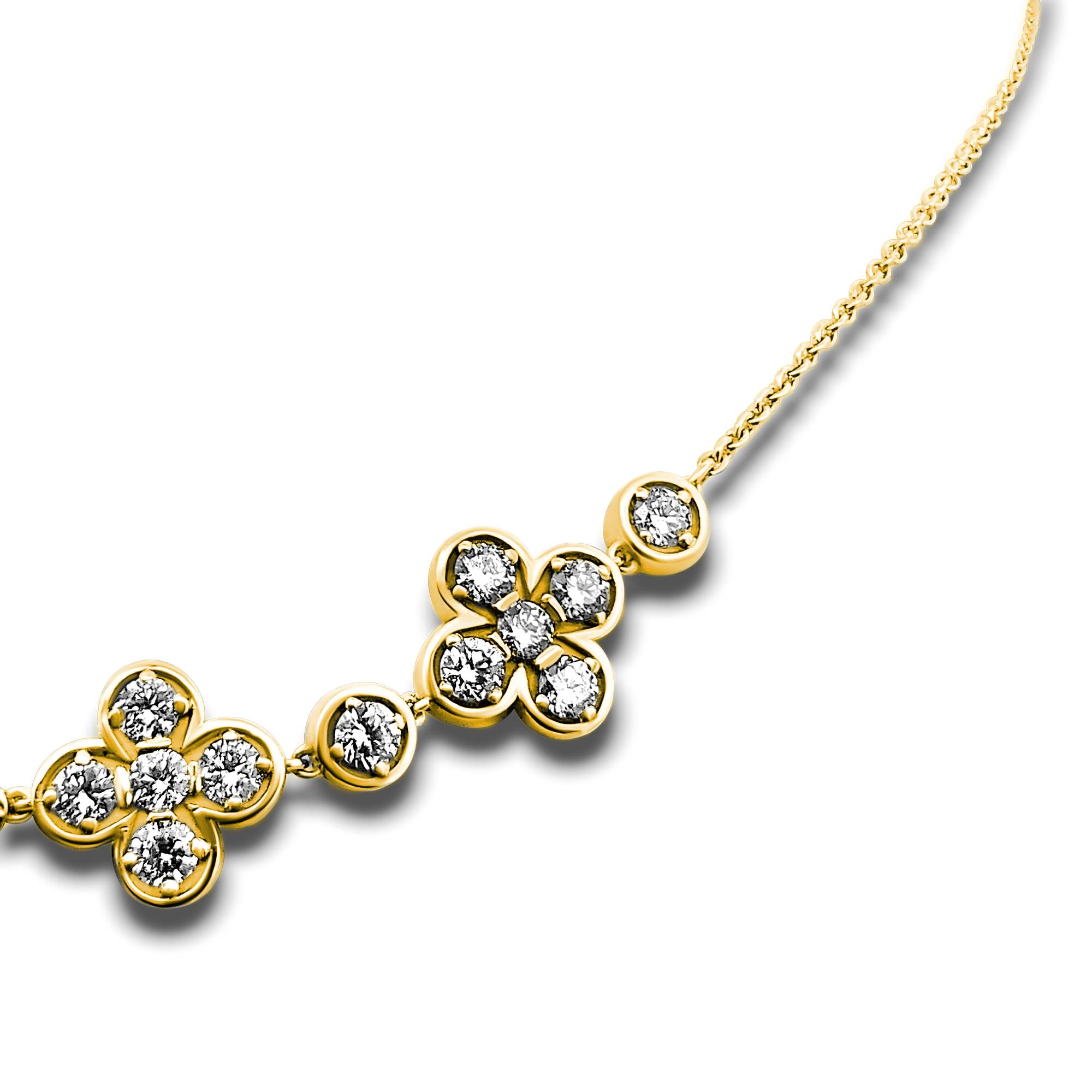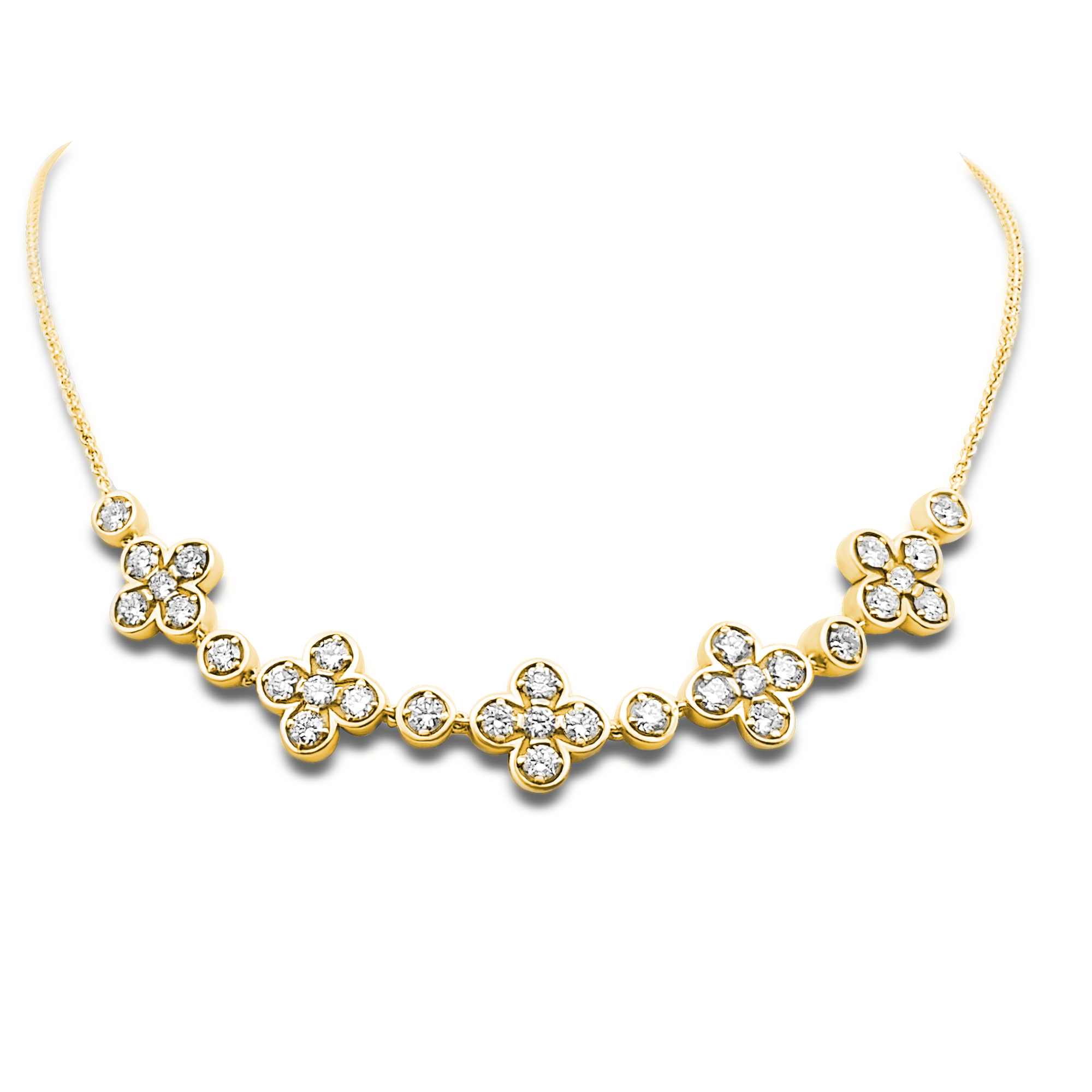 Création artisanale de l’atelier Golaz. Collier en or blanc avec 5 motifs en forme de trèfles à 4 , serti de diamants cultivés en laboratoire