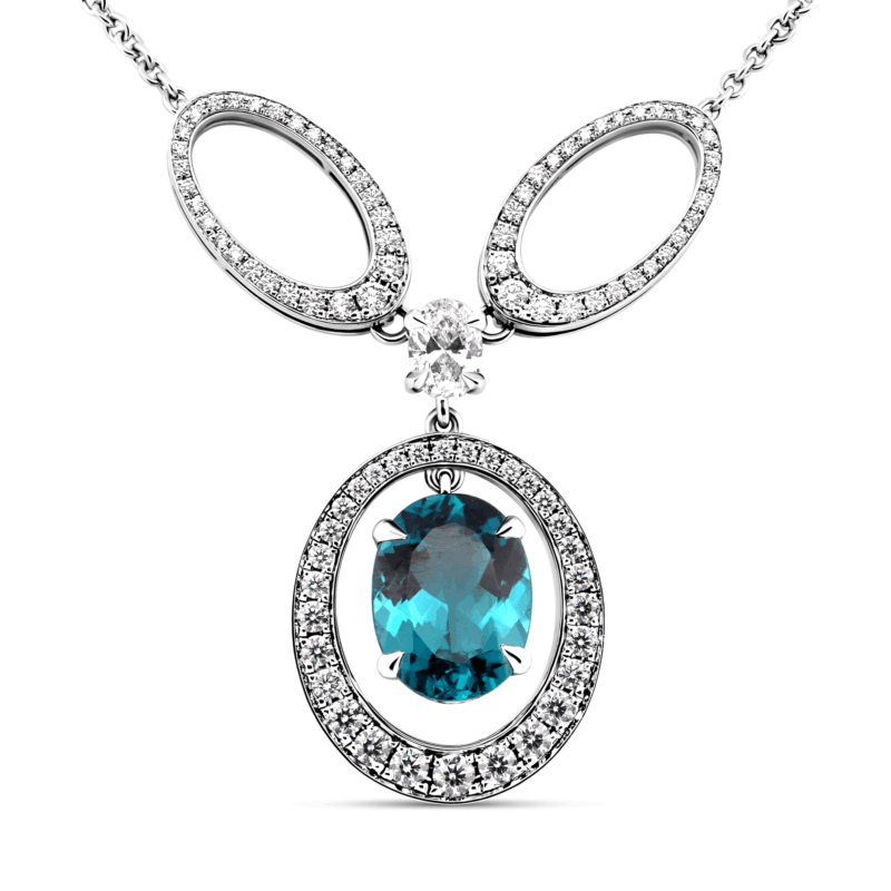 Création artisanale de l’atelier Golaz. Collier en or blanc avec une tourmaline indicolite mobile et 3 ovals sertis de 57 diamants du Canada et un diamant oval