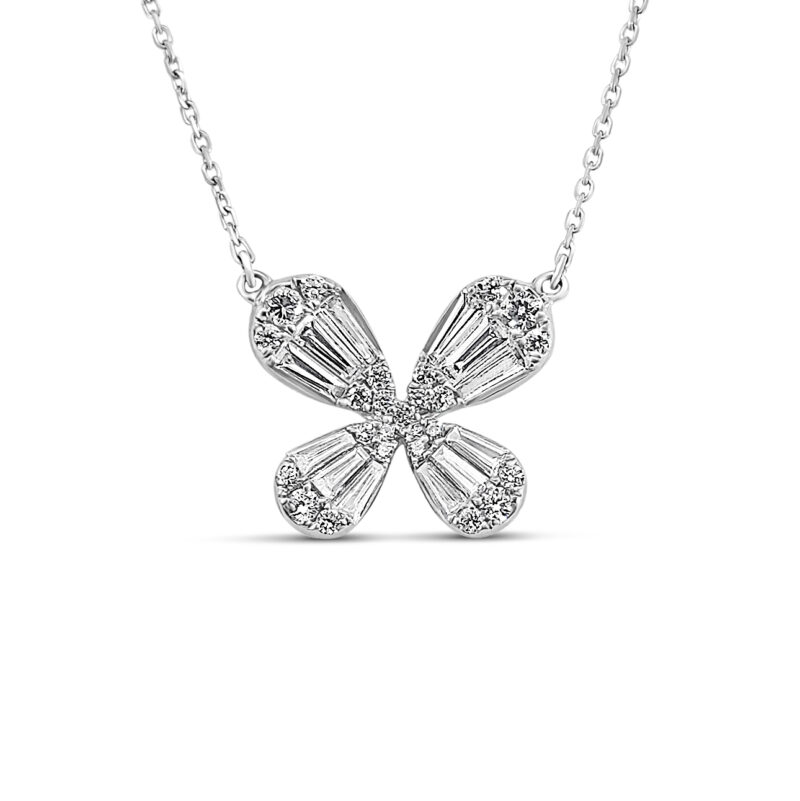 Collier Ligne Vendôme, sertie de diamants taille brillants et baguettes, dessinant un délicat papillon à l’élégance graphique et intemporelle.