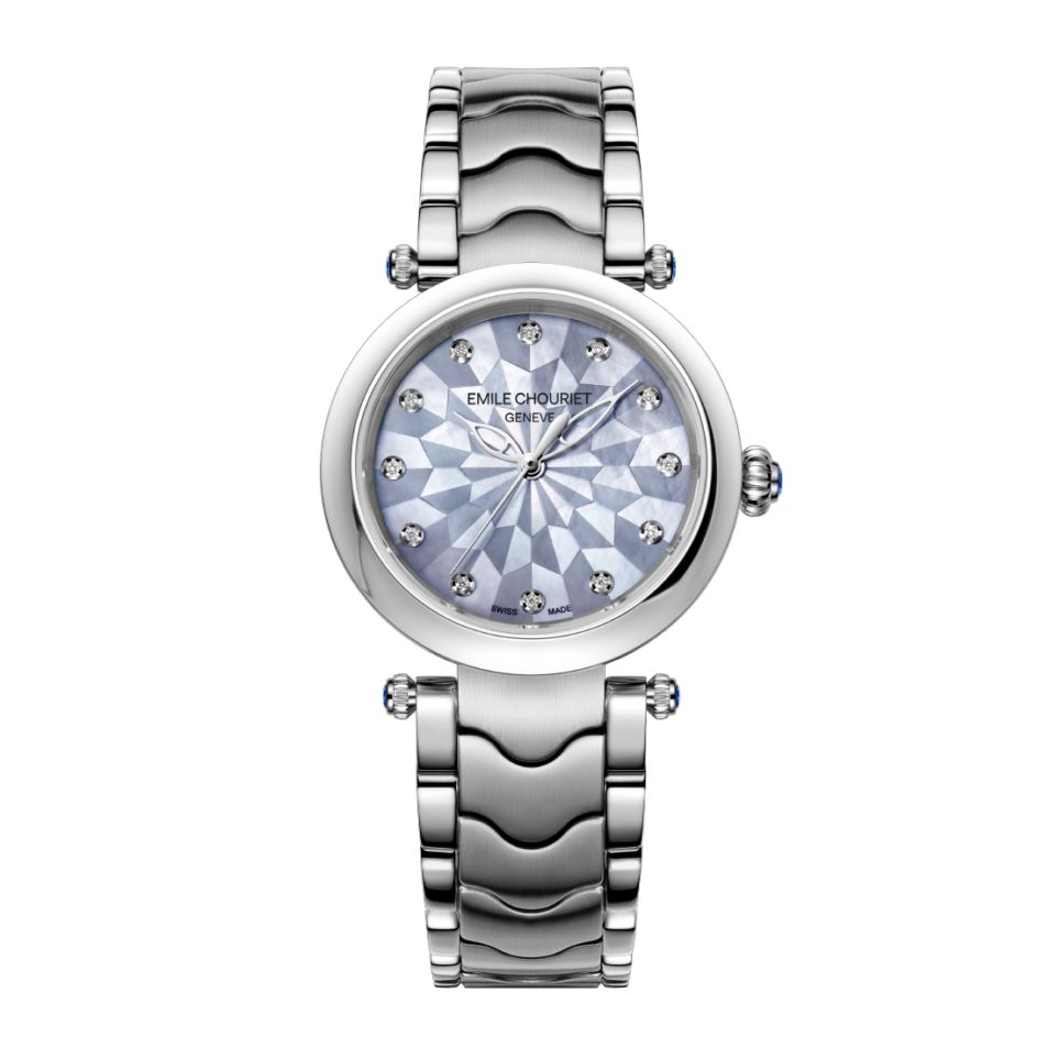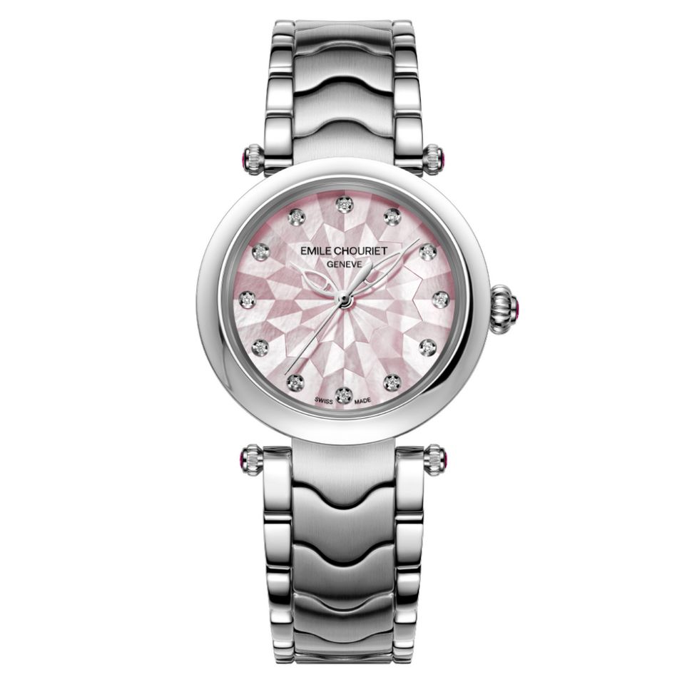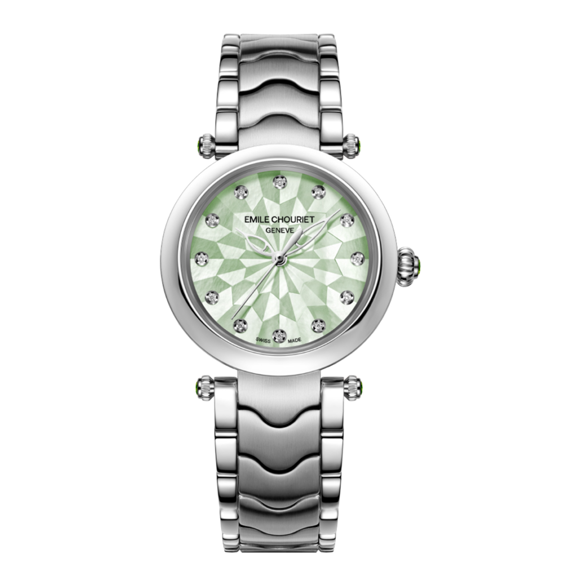 La Fair Lady d’Émile Chouriet incarne l’élégance féminine à travers des lignes épurées et des détails raffinés. Son cadran, orné d’un motif floral tridimensionnel inspiré du lotus, évoque la délicatesse et la grâce. Les index en diamants ou en saphirs ajoutent une touche de lumière, tandis que les aiguilles en forme de feuilles soulignent la poésie du design.