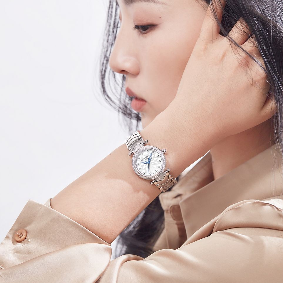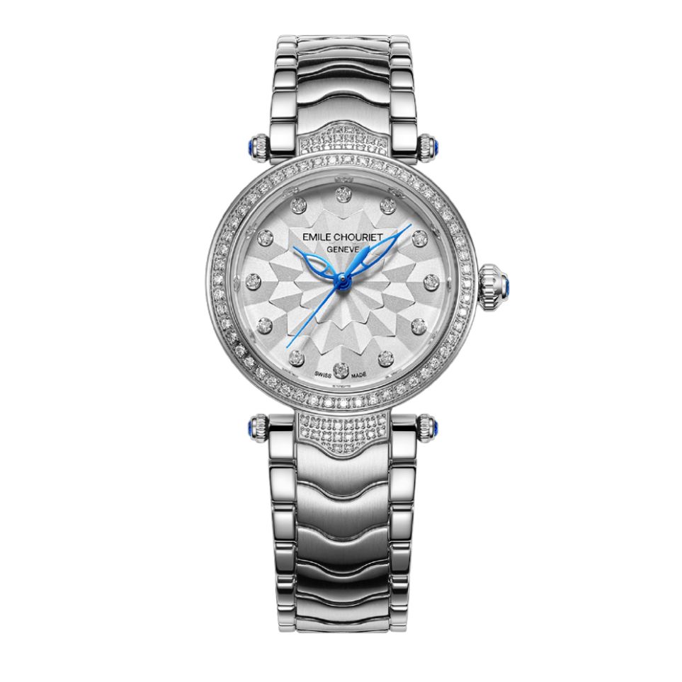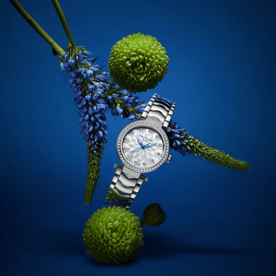 La Fair Lady d’Émile Chouriet incarne l’élégance féminine à travers des lignes épurées et des détails raffinés. Son cadran, orné d’un motif floral tridimensionnel inspiré du lotus, évoque la délicatesse et la grâce. Les index en diamants ou en saphirs ajoutent une touche de lumière, tandis que les aiguilles en forme de feuilles soulignent la poésie du design.