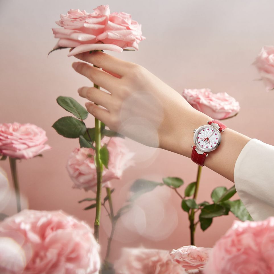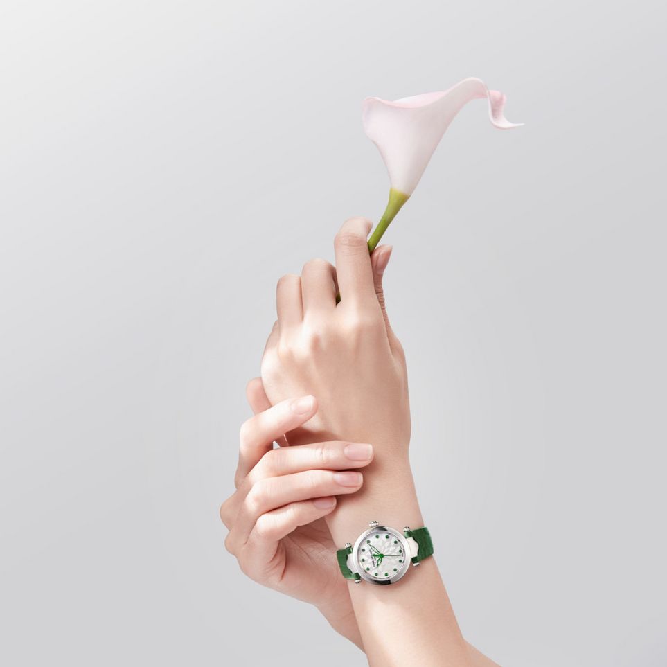 La Fair Lady d’Émile Chouriet incarne l’élégance féminine à travers des lignes épurées et des détails raffinés. Son cadran, orné d’un motif floral tridimensionnel inspiré du lotus, évoque la délicatesse et la grâce. Les index en diamants ou en saphirs ajoutent une touche de lumière, tandis que les aiguilles en forme de feuilles soulignent la poésie du design.