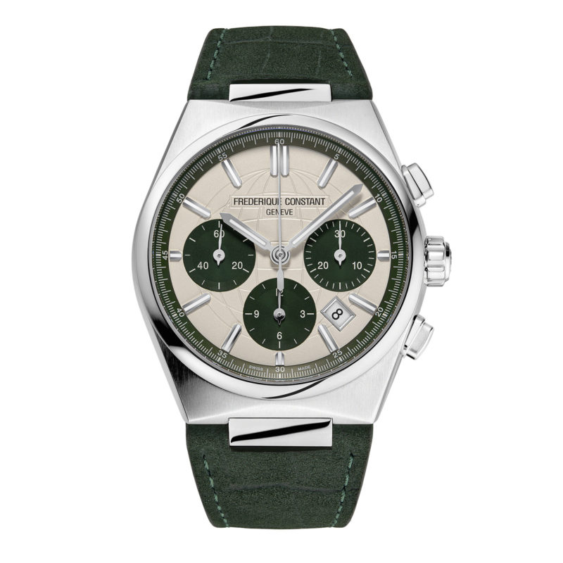 La collection vitrine de Frederique Constant célèbre cette année son vingt-cinquième anniversaire et dévoile pour l’occasion de toutes nouvelles variations de son modèle sportif, le Chronographe Automatique 41 millimètres. Cette édition limitée à 1888 pièces, logée dans un boîtier en acier, offre la combinaison inhabituelle d’un cadran opalin avec des compteurs verts, donnant un ton contemporain et plus sportif. Animée par le calibre FC-391 avec sa réserve de marche de 60 heures, la pièce sera livrée avec trois bracelets interchangeables, comme le veut la coutume.