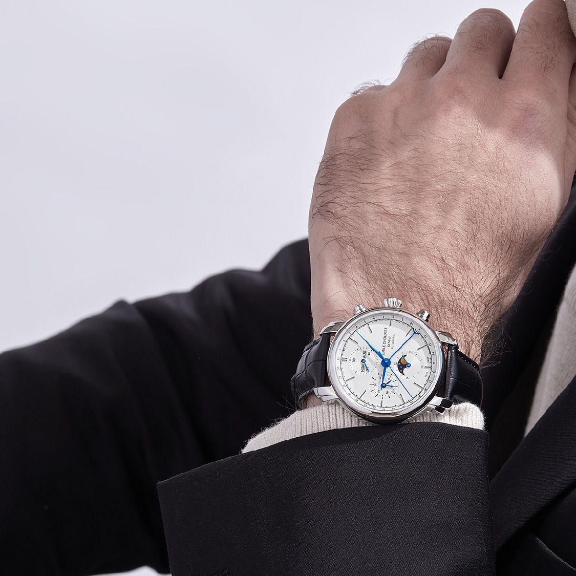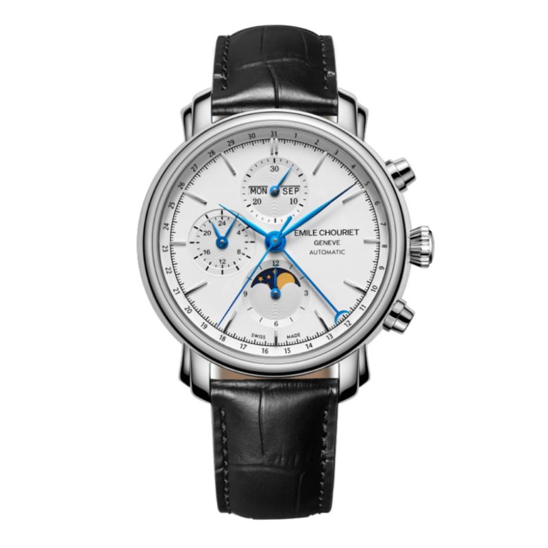 La Lac Léman Chronograph Moon Phase célèbre l’union parfaite entre la tradition horlogère suisse et la poésie du ciel nocturne. Son cadran raffiné intègre subtilement les fonctions chronographe et phase de lune, offrant une lecture du temps à la fois technique et onirique. Inspirée par les reflets du Léman sous la lune, cette montre incarne une élégance intemporelle, pensée pour les amateurs de précision et de beauté céleste.