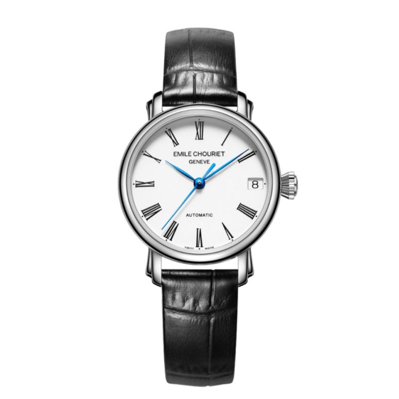 La Lac Léman Lady d’Émile Chouriet incarne l’élégance intemporelle de l’horlogerie suisse dans un format délicat de 30 mm. Avec son boîtier en acier inoxydable elle allie raffinement et sobriété. Animée par le calibre automatique EC9312, elle offre une réserve de marche de 42 heures et une fonction date discrètement positionnée à 3 heures. Son fond transparent révèle la finesse de son mouvement, tandis que son étanchéité jusqu’à 30 mètres assure une utilisation quotidienne en toute sérénité.