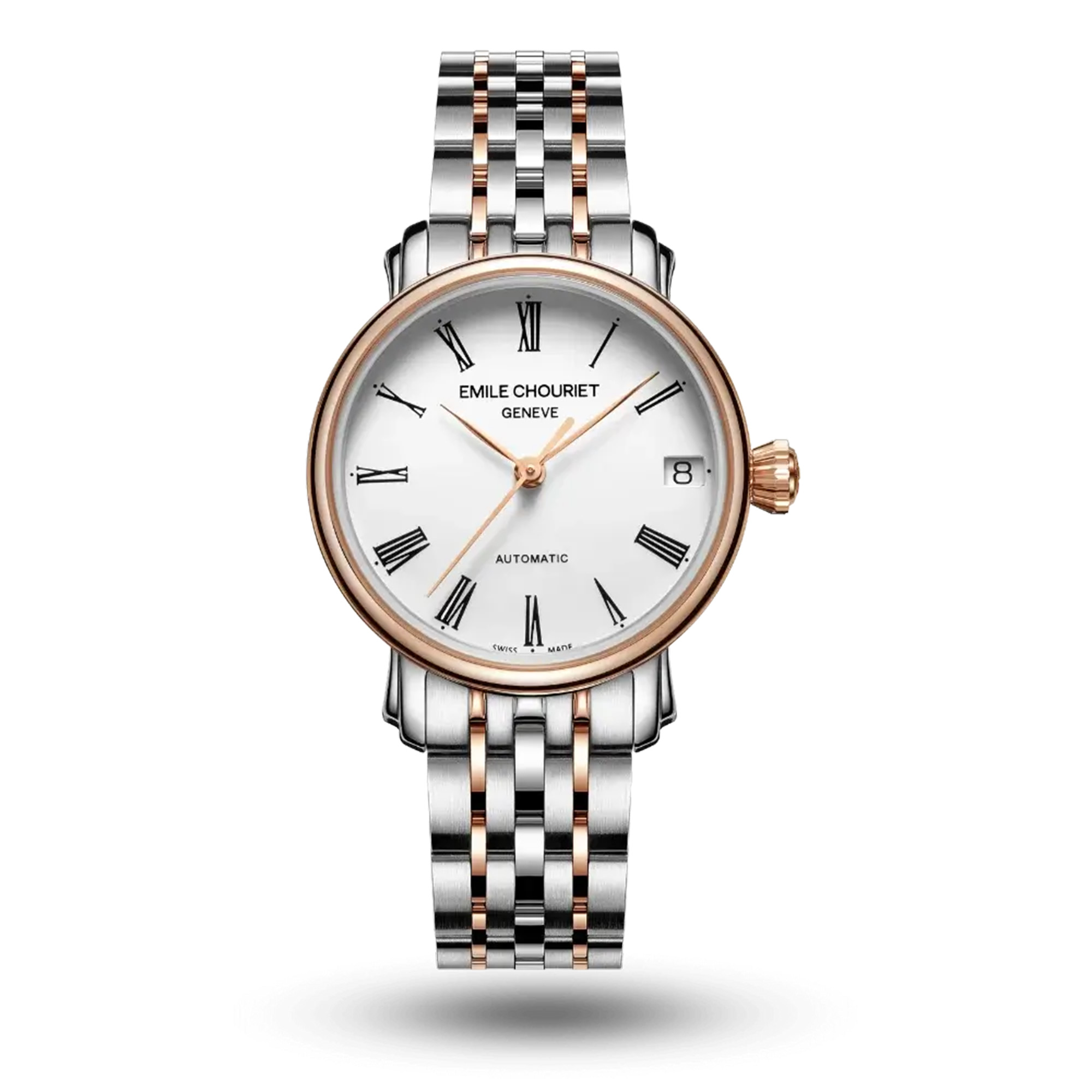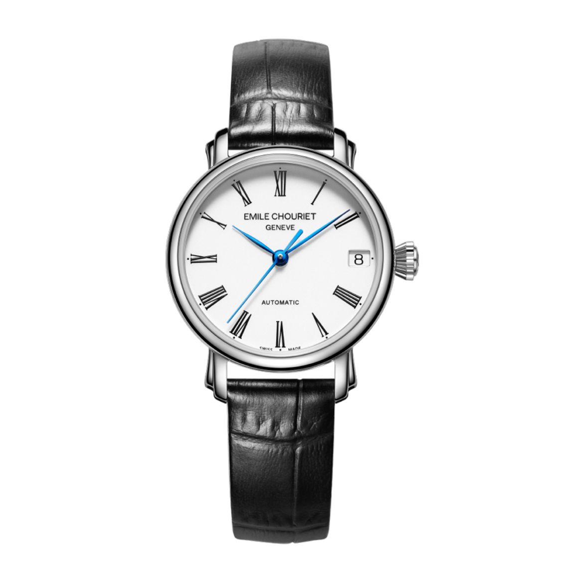 La Lac Léman Lady d’Émile Chouriet incarne l’élégance intemporelle de l’horlogerie suisse dans un format délicat de 30 mm. Avec son boîtier en acier inoxydable  elle allie raffinement et sobriété. Animée par le calibre automatique EC9312, elle offre une réserve de marche de 42 heures et une fonction date discrètement positionnée à 3 heures. Son fond transparent révèle la finesse de son mouvement, tandis que son étanchéité jusqu’à 30 mètres assure une utilisation quotidienne en toute sérénité.