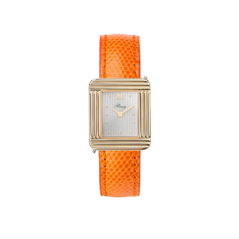 La montre est fournie avec un bracelet lézard orange.