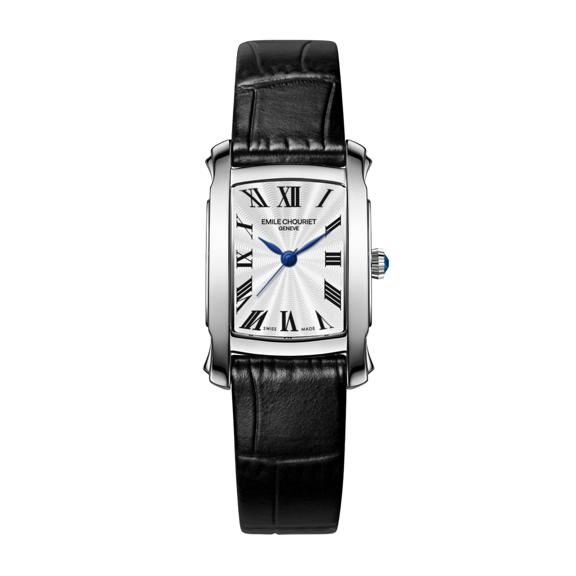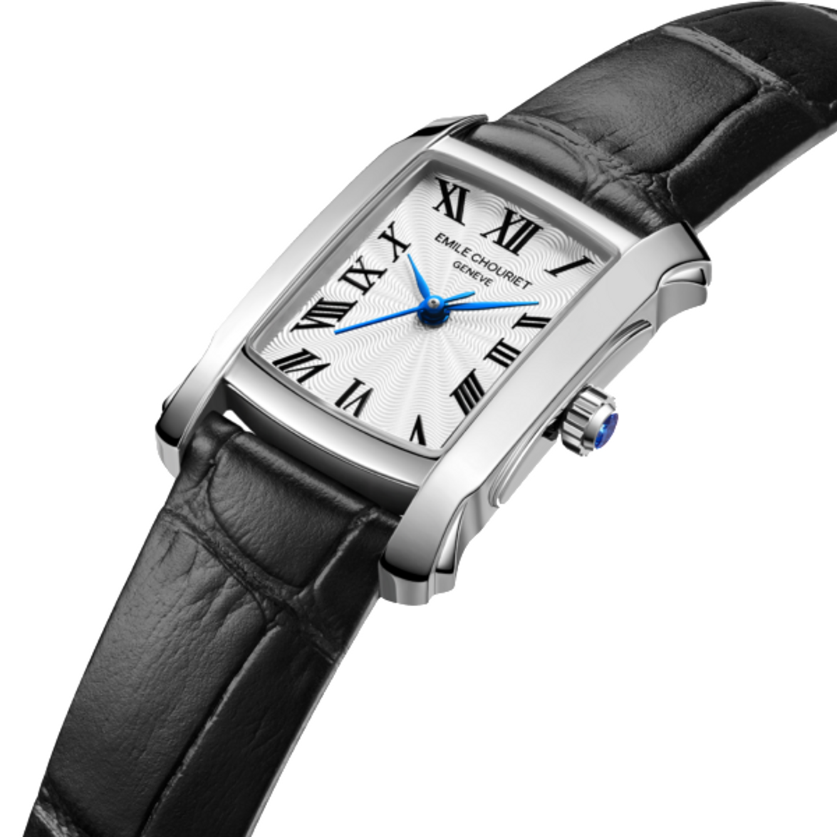 La Odyssée se distingue par son boîtier rectangulaire en acier inoxydable de 23,4 x 20,1 mm, aux lignes courbes et aux cornes en forme d’ailes, signature de la maison Emile Chouriet. Son cadran blanc guilloché, orné de chiffres romains peints et d’aiguilles feuilles colorées (bleues, rouges ou vertes), offre une lisibilité optimale et une touche de couleur subtile. La couronne est sertie d’un cabochon assorti, ajoutant une note de sophistication