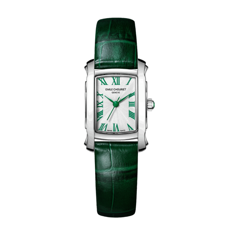 La Odyssée se distingue par son boîtier rectangulaire en acier inoxydable de 23,4 x 20,1 mm, aux lignes courbes et aux cornes en forme d’ailes, signature de la maison Emile Chouriet. Son cadran blanc guilloché, orné de chiffres romains peints et d’aiguilles feuilles colorées (bleues, rouges ou vertes), offre une lisibilité optimale et une touche de couleur subtile. La couronne est sertie d’un cabochon assorti, ajoutant une note de sophistication