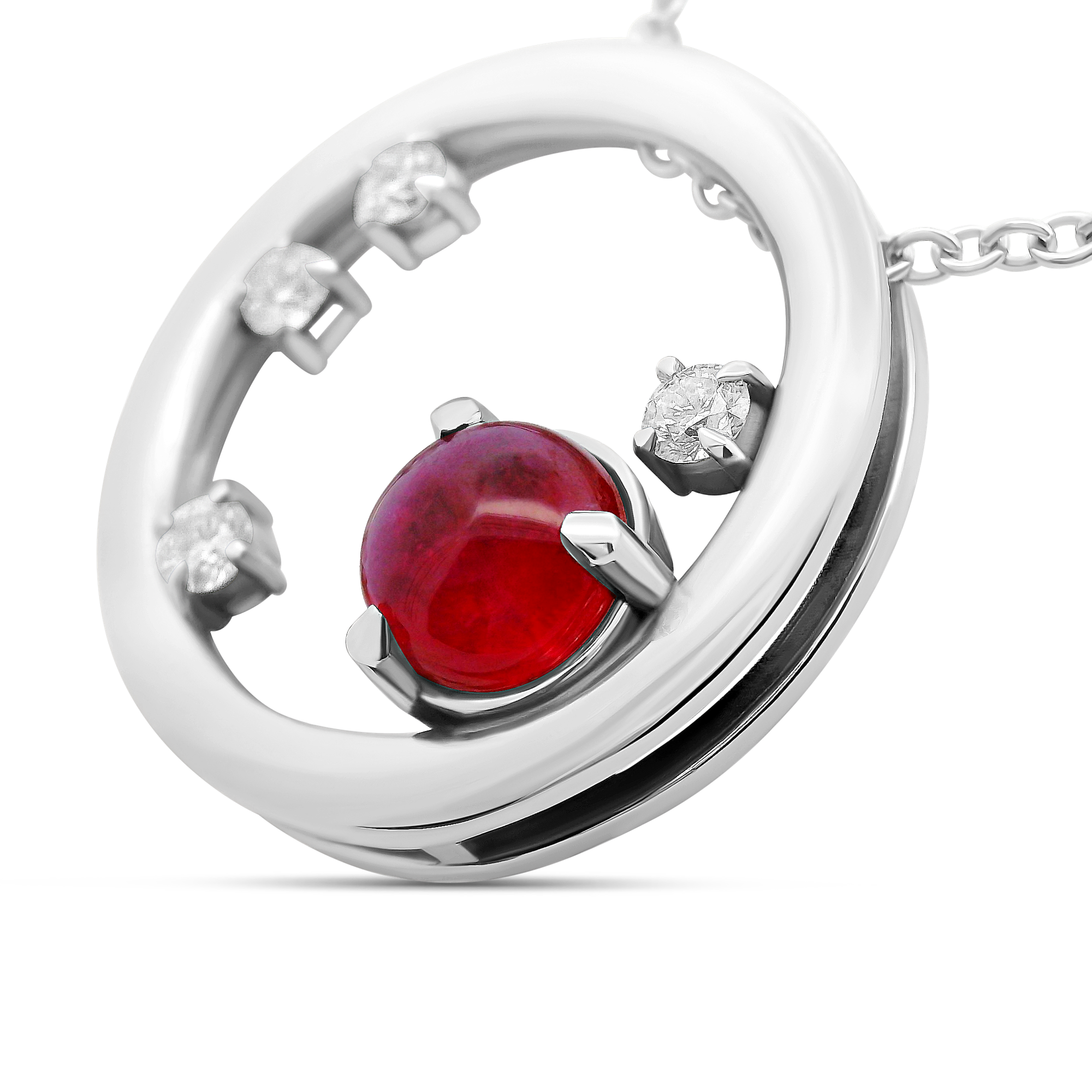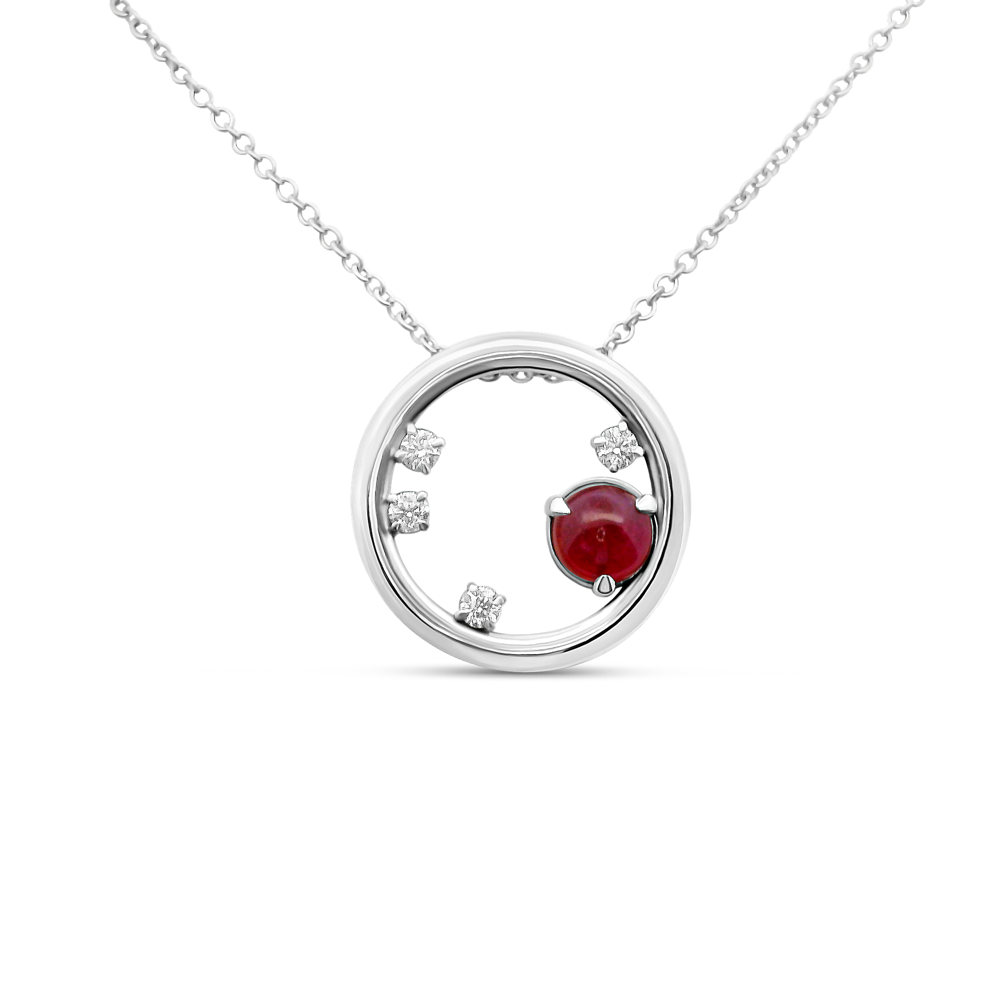 Création artisanale de l’atelier Golaz. pendentif or blanc en forme de cercle, seerti dun rubis du Groenland cabochon et rehaussés de 4 diamants d’origine canadienne.(chaine vendue séparément)