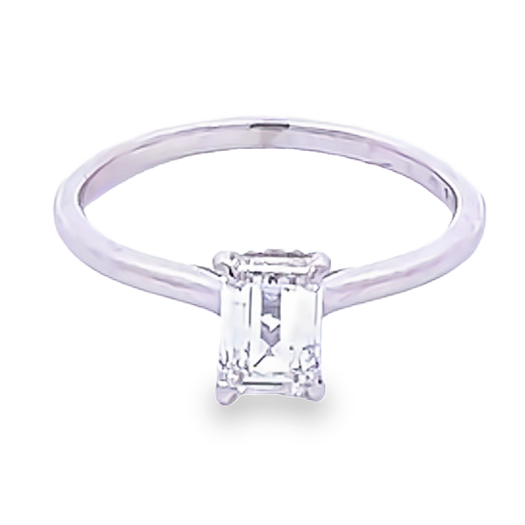Création artisanale de l’atelier Golaz. Solitaire or blanc orné d’un diamant taille emeraude serti 4 griffes dans un chaton arborant un discret coeur de chaque côté.